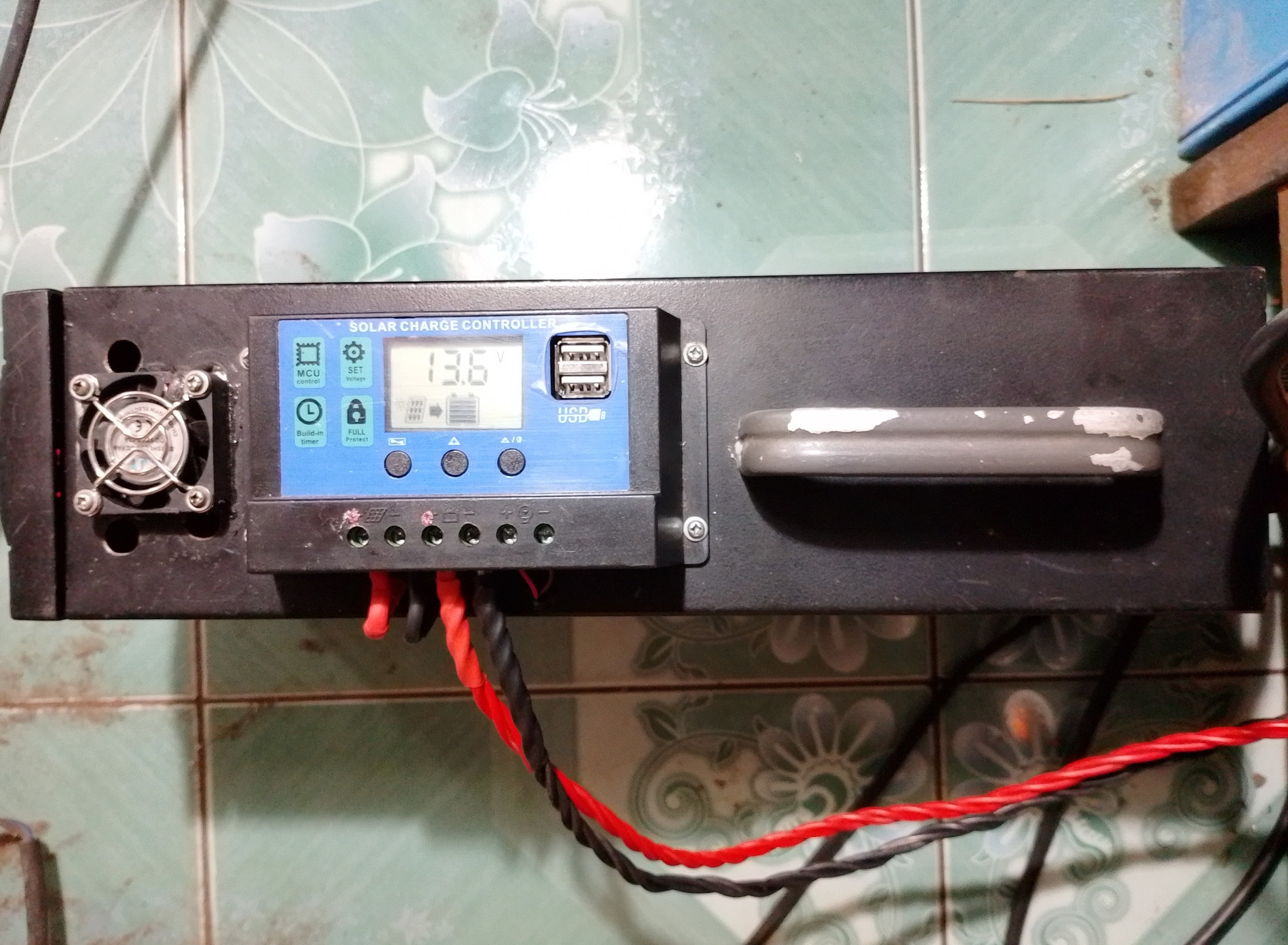 รูปถ่ายเมื่อใช้ไฟฟ้าจากเครื่องจ่ายไฟเอนกประสงค์ซึ่งผมใช้ UPS เก่ามาดัดแปลง ภายในมีหม้อแปลงเทอรอยด์ขนาดใหญ่ต่อผ่านวงจรเรียงกระแสแล้วลดแรงดันด้วยบั๊คคอนเวอร์เตอร์กระแสสูง ภาคจ่ายไฟตัวนี้ปรับแรงดันด้วยการเร่ง VR ทดรอบและผมใส่ตัวต้านทานแปรค่าจำกัดการปรับแรงดันไว้ที่ 10-27V ด้านหลังมีขั้วดำ-แดงไว้ต่อกับแผงโซล่าเซลล์โดยใช้ได้โอด 20A เป็น Blocking Diode ป้องกันไม่ให้กระแสไฟฟ้าไหลย้อนกลับจากแบตเตอรี่ไปยังแผงโซลาร์เซลล์