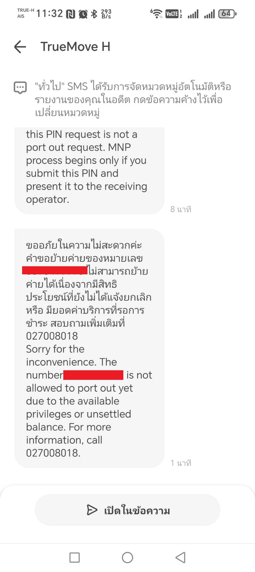 ขอสอบถามหน่อยครับว่าทำไมผมขอย้ายจากDtac ไป TrueH ไม่ได้ มีsms จาก True มาบอกว่าหมายเลขนี้โอนย้ายไม่ได้เพราะไม่ใช่หมายเลขผู้โอน ทั้งๆที่เบอร์นี้เป็นเบอร์ของผม