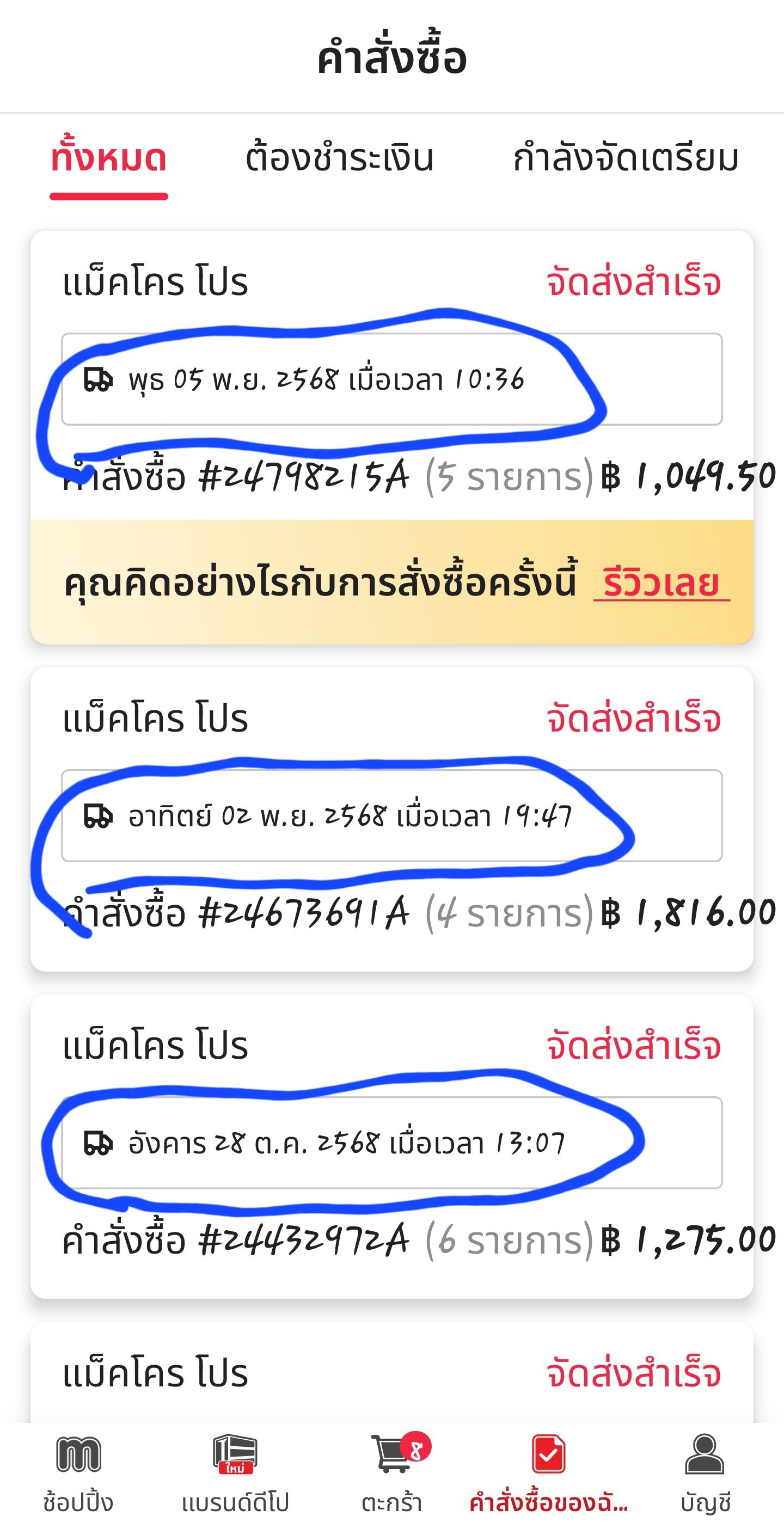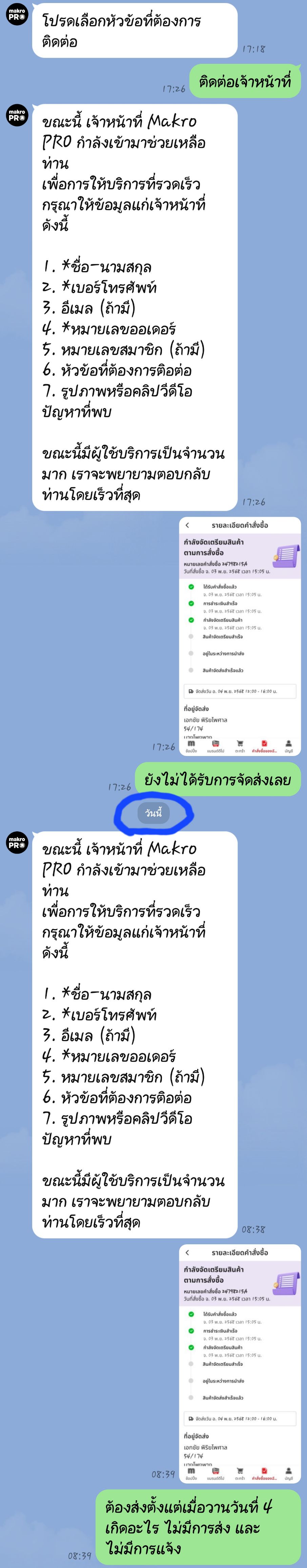 - คำสั่งซื้อวันที่ 3 พ.ย. และต้องจัดส่งวันที่ 4 พ.ย. ถึงเวลานัดส่งก็ไม่มีการจัดส่ง เลยแชทถามในไลน์ เหมือนเดิมทุกครั้ง คือไม่ตอบ หรือ ไม่ก็ตอบข้ามไปอีกวัน เลยคิดว่าคงจัดส่งถึงช่วงดึก จนวันที่ 5 แย่เข้าไปอีก ไม่มีการจัดส่ง และ ไม่มีการโทรแจ้งเลย ไลน์ก็ไม่ตอบ โทรเข้าศูนย์ 10 นาที ก็สายไม่ว่าง ผมว่าบริษัทใหญ่โต แต่ไม่มีมาตราฐานในการบริการเลย เวลาเกิดปัญหาพนักงานแมคโครก็ไม่มีการโทรแจ้งใดๆ ทุกครั้งจะเป็นพนักงานขนส่งแจ้ง กลายเป็นภาระของลูกค้าที่ต้องติดตามสินค้าเอง บริการแย่แบบนี้ ปิดชั่วคราวไปดูว่าเกิดจากระบบ หรือ ระบบขนส่งไม่พอ (ได้ยินจากพนักงานขนส่งมาว่า กดราคาจนไม่คุ้ม)