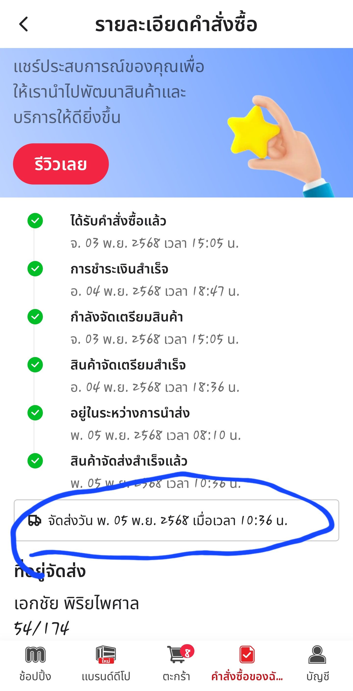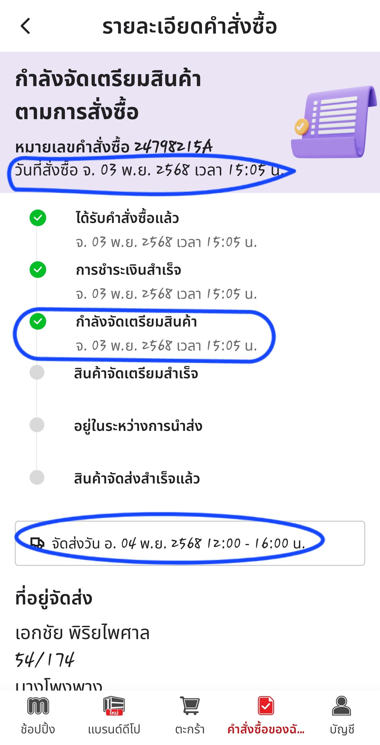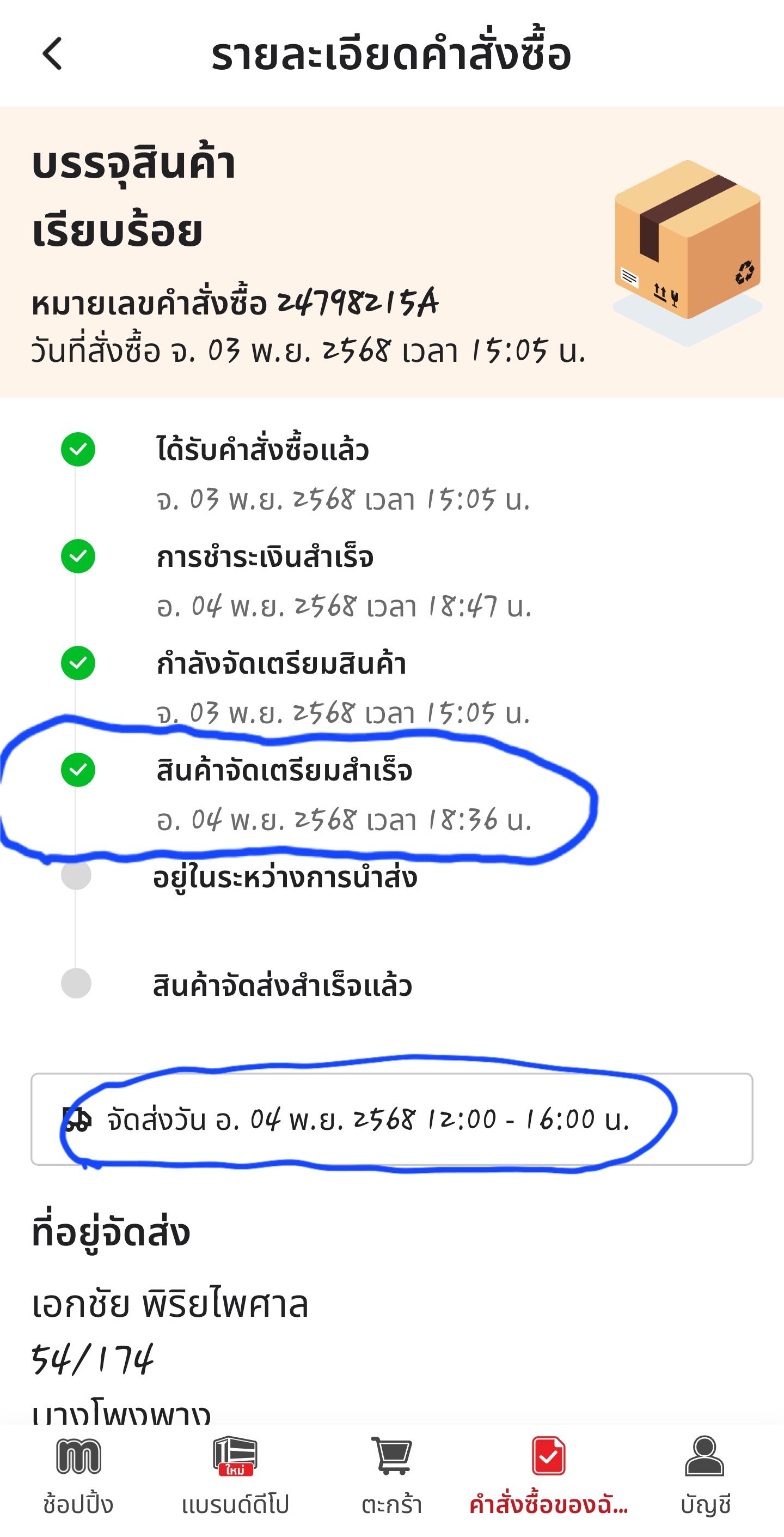 - คำสั่งซื้อวันที่ 1 พ.ย. และต้องจัดส่งวันที่ 2 พ.ย. ถึงเวลานัดส่งก็ไม่มีการจัดส่ง จนช่วงเย็นๆ พนักงานขนส่งได้โทรแจ้งว่าจัดส่งไม่ทัน จะจัดส่งให้วันถัดไป ผมก็ว่าต้องการใช้สินค้าด่วน พนักขนส่งแจ้งจะจัดส่งให้ ประมาณ 21.00 น. ก็ได้มีการจัดส่งเรียบร้อย