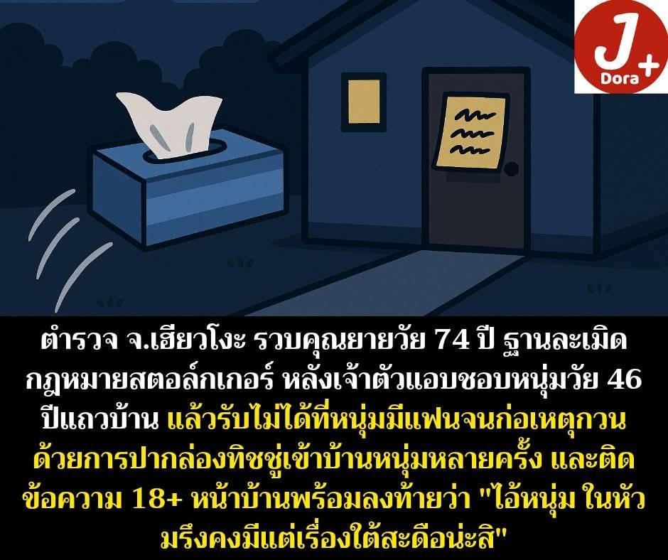 เกิดเหตุหญิงสูงวัย อายุ 74 ปีในจังหวัดเฮียวโงะถูกจับกุม ฐานละเมิดกฎหมายป้องกันสตอล์กเกอร์ หลังก่อเหตุขว้างกล่องทิชชู่หลายครั้ง และติดข้อความลามกไว้ที่หน้าบ้านชายหนุ่มวัย 46 ปีแถวบ้านที่ตนแอบชอบ