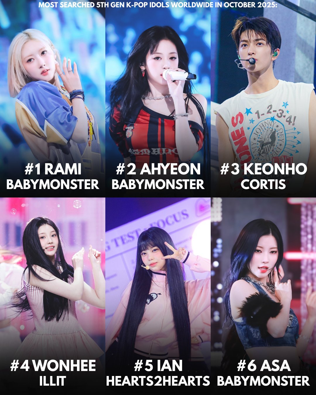 RAMI และ AHYEON เป็นไอดอลเคป๊อปเจน 5 รวมชายหญิงที่ถูกสืบค้นมากที่สุดในโลกเป็นอันดับ 1 และ 2 ในเดือนตุลาคม 2025