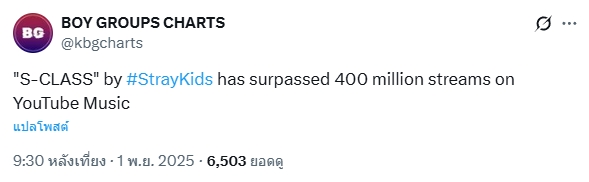 🔥 Stray Kids "S-CLASS" มียอดสตรีมบน YouTube Music เกิน 400 ล้านครั้งแล้ว