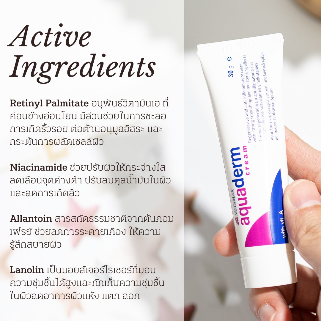สำหรับคนที่กังวลเรื่องริ้วรอยเราอยากให้ลองอีกสูตรคือ aqua cream ที่มาในจังหวะของการเป็นมอยซ์เจอร์ไรเซอร์เหมือนกันแต่ใช้เฉพาะในช่วงกลางคืน ด้วยสารแอคทีฟอย่าง Retinyl Palmitate อนุพันธ์วิตามินเอ ที่ค่อนข้างอ่อนโยน มีส่วนช่วยในการชะลอการเกิดริ้วรอย ต่อต้านอนุมูลอิสระ และกระตุ้นการผลัดเซลล์ผิวนอกจากนี้ยังได้