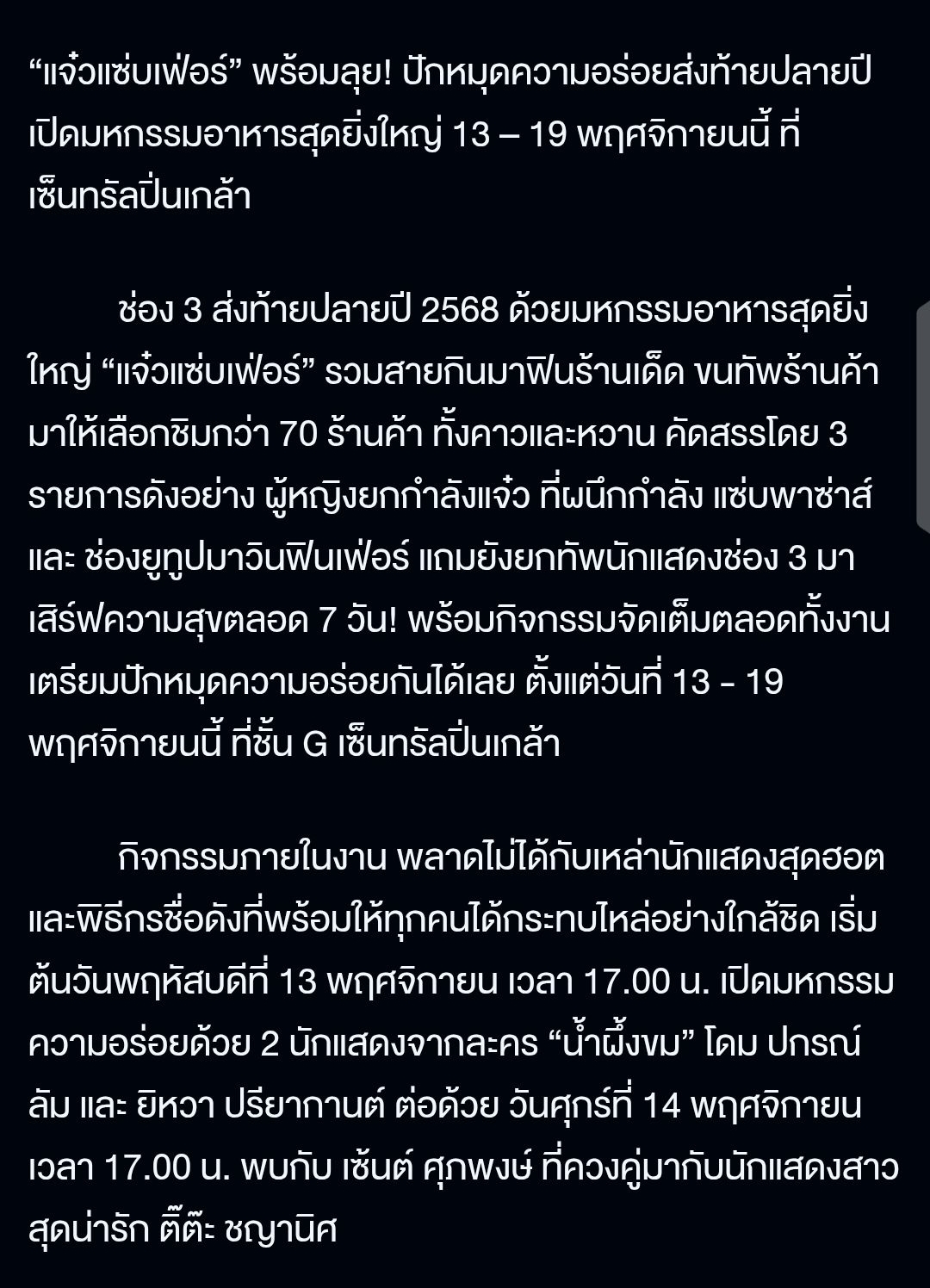 📌 “แจ๋วแซ่บเฟ่อร์” พร้อมลุย 😋 ความอร่อยส่งท้ายปลายปี เปิดมหกรรมอาหารสุดยิ่งใหญ่ ที่ เซ็นทรัลปิ่นเกล้า