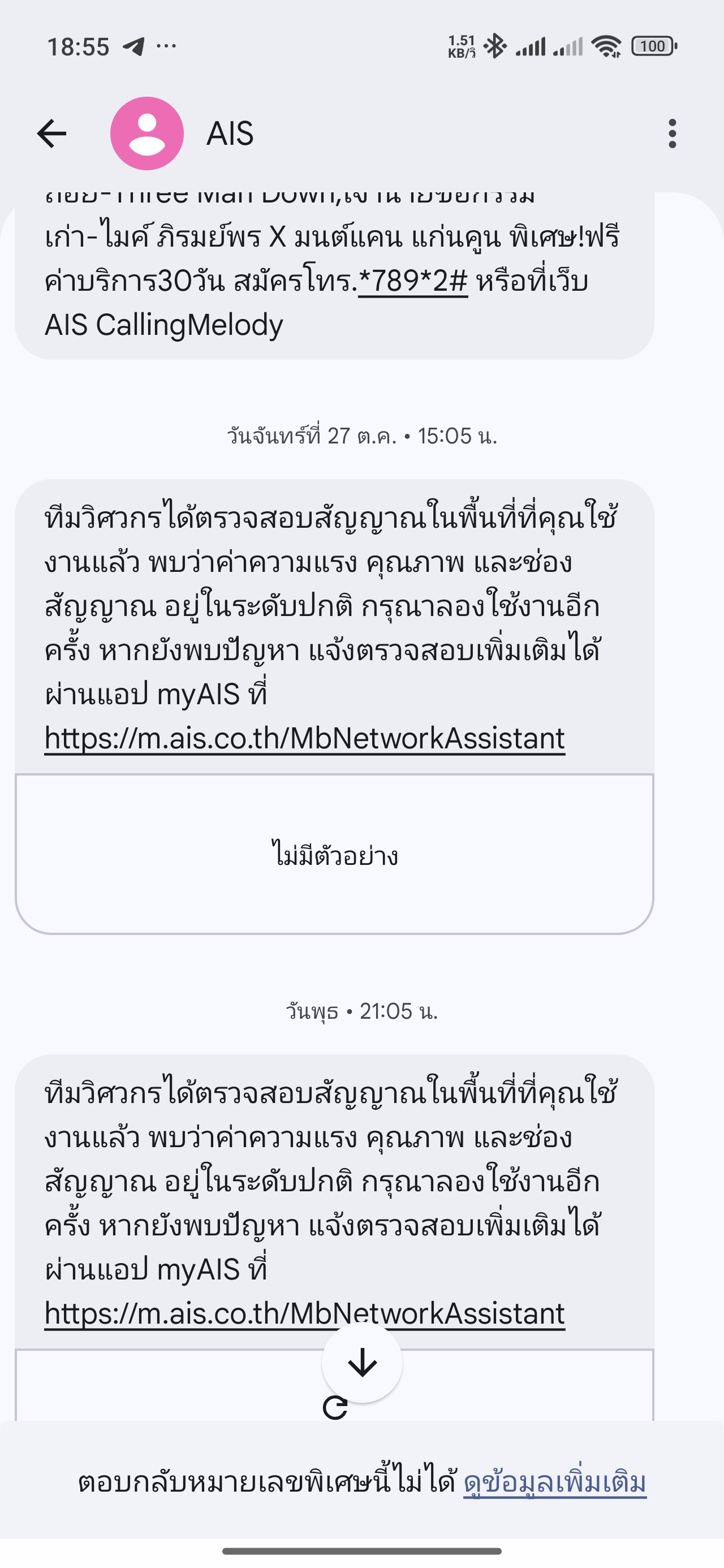 แล้วไหนจะเรื่องสัญญาณอีกเคยโทรแจ้งไปหลายครั้งต้องรอทางวิศวกรตรวจสอบเป็นอาทิตย์พอตรวจสอบเสร็จแจ้งมาแค่ว่าสัญญาณคุณภาพปกติไม่มีปัญหาอะไร ถามจริงถ้าลูกค้าไม่มีปัญหาเขาจะแจ้งทำไมจะบอกว่าลูกค้าแกล้งอย่างนี้หรอไม่เข้าใจ AIS เลยตอนนี้ว่าทำไมถึงห่วยลงขนาดนี้เป็นหลายครั้งแล้ว