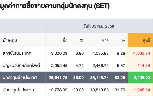 Sinthorn Summary 5/11/2568 : ต่างชาติซื้อสุทธิ 2,496.02 ลบ.