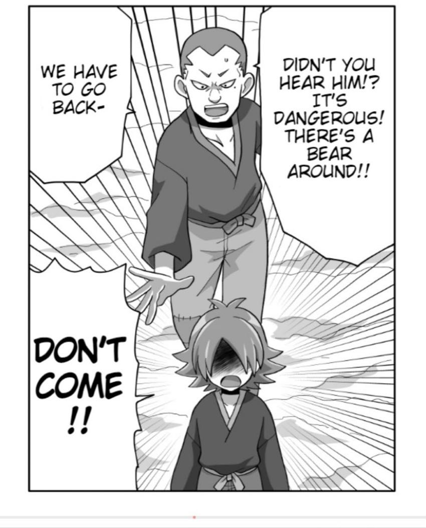 วันถัดมา มีชาวบ้านมาแจ้งข่าวว่ามีหมีร้ายอยู่บริเวณป่าใกล้หมู่บ้านให้ทั้งคู่ระวังตัวไว้ ซาเมโอกะก็กังวลว่าถ้ามีหมีอยู่แถวนี้อาจจะทำให้ไร่นาของเขาได้รับความเสียหาย ฟุบุคิได้ยินดังนั้นจึงขอเดินทางเข้าป่าไป โดยไม่ยอมให้ซาเมโอกะตามมาด้วย