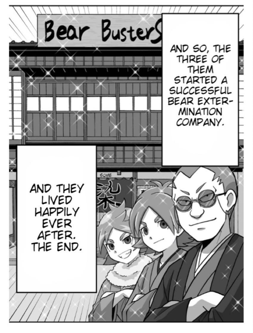 สองพี่น้องเห็นดังนั้นก็ยิ้ม จบเรื่องโดยที่ทั้งสามเปิดบริษัทรับจ้างปราบหมี(?) และอยู่ด้วยกันอย่างมีความสุข