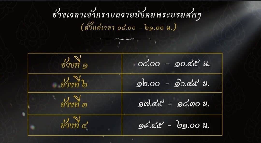 📌 สำนักพระราชวังกำหนดให้ประชาชนสามารถเข้าถวายสักการะพระบรมศพ ใน 4 ช่วงเวลา ดังนี้