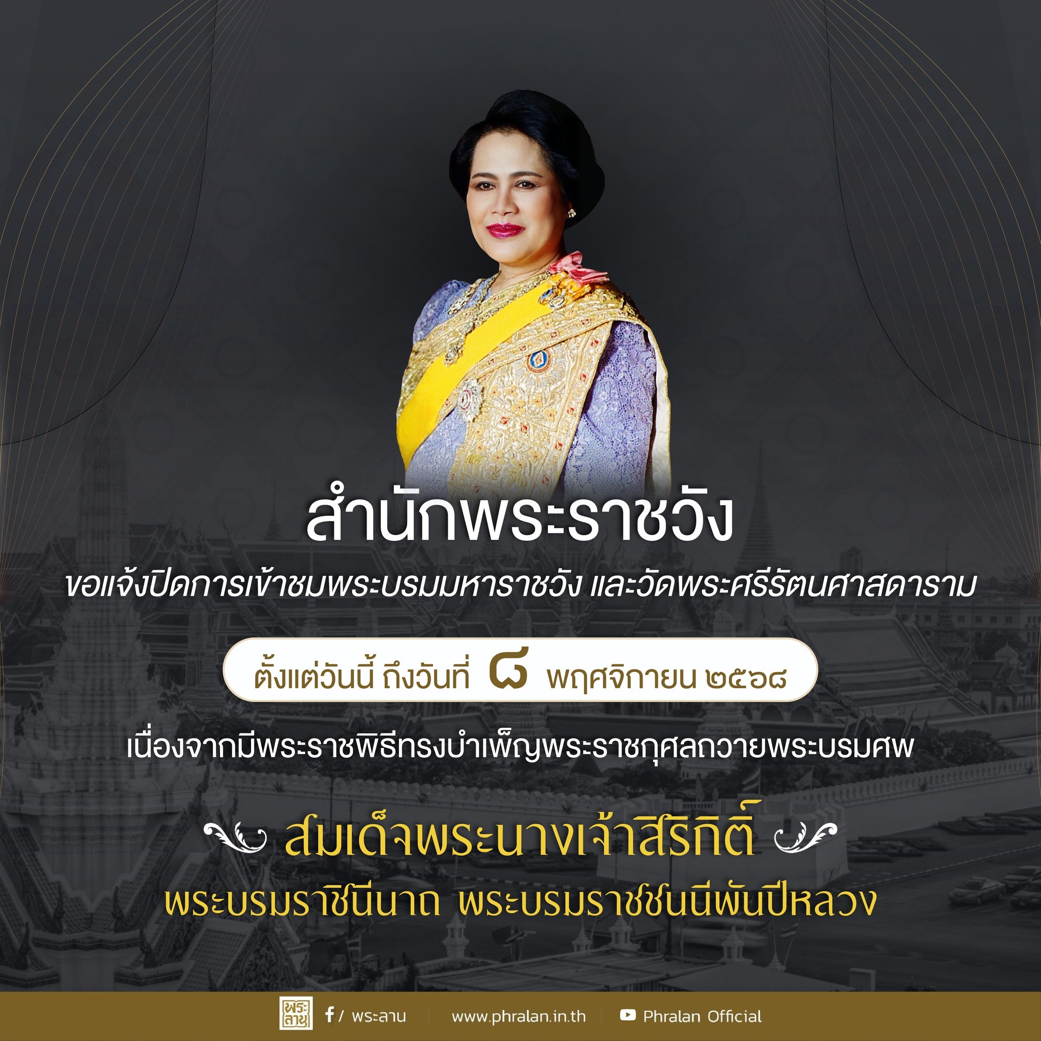 🙏 ตามที่ สำนักพระราชวังได้รับพระราชทานพระบรมราชานุญาตให้ประชาชนเข้าถวายสักการะพระบรมศพ สมเด็จพระนางเจ้าสิริกิติ์ พระบรมราชินีนาถ พระบรมราชชนนีพันปีหลวง ณ พระที่นั่งดุสิตมหาปราสาท ภายหลังจาก การพระราชพิธีทรงบำเพ็ญพระราชกุศลครบ 15 วัน โดยจะเปิดให้เข้ากราบถวายบังคม ทุกวัน เวลา 08.00 – 21.00 น. เริ่มตั้งแต่ วันอาทิตย์ที่ 9 พฤศจิกายน 2568 เป็นต้นไปนั้น