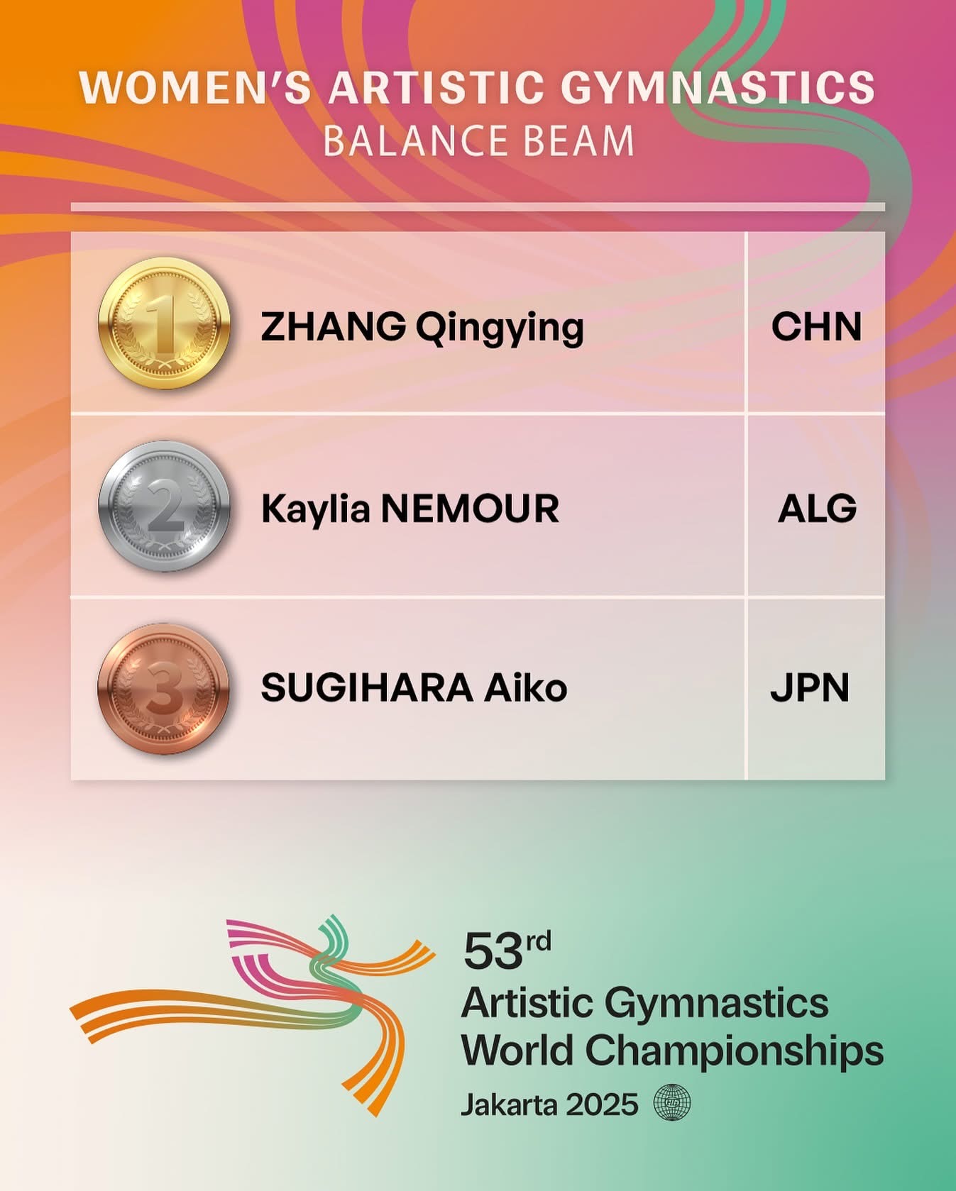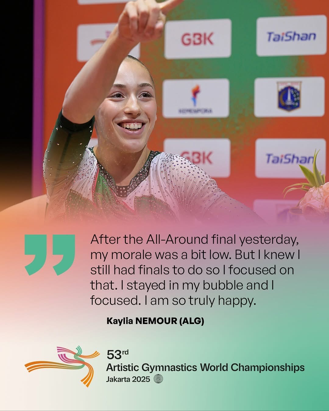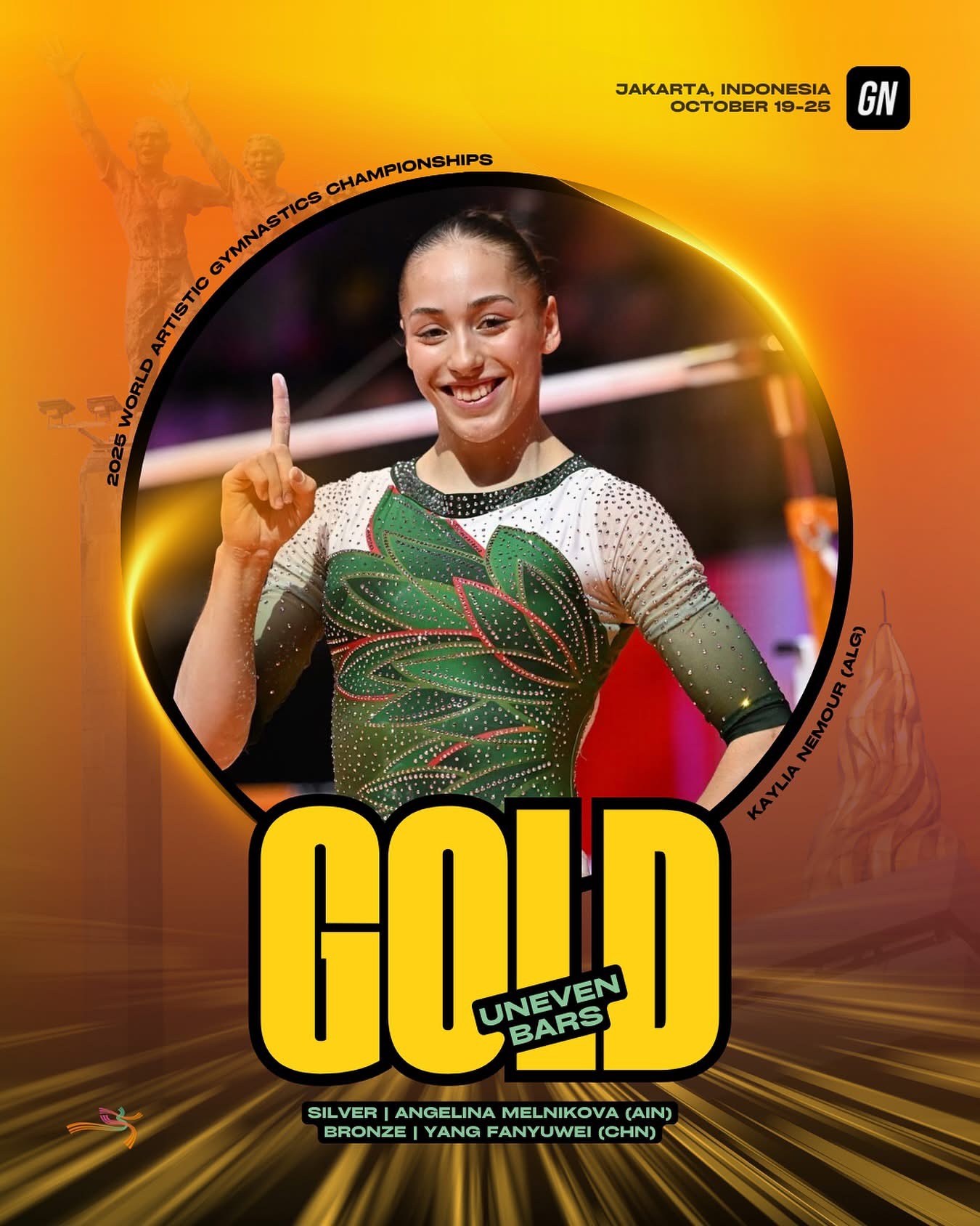 รายการ 53rd FIG Artistic Gymnastics World Championships 2025 หรือการแข่งขันยิมนาสติกสากลชิงแชมป์โลก 2025 ณ กรุงจากาตาร์ ประเทศอินโดนีเซีย ระหว่างวันที่ 19-25 ตุลาคม 2568 ที่ผ่านมา ผลปรากฏว่า Kaylia Nemour ดาวรุ่งพุ่งแรงขาวแอลจีเรีย (เกิดที่ฝรั่งเศส, พ่อเป็นชาวแอลจีเรีย ส่วนแม่เป็นชาวฝรั่งเศส) วัย 18 ปี สามารถคว้าเหรียญทองแรกให้กับแอลจีเรียได้ตามคาดในอุปกรณ์ประเภทบาร์ต่างระดับด้วยคะแนน 15.566 !!! นอกจากนี้เธอยังคว้าเหรียญทองแดงในอุปกรณ์ประเภทคานทรงตัวได้อีกด้วย