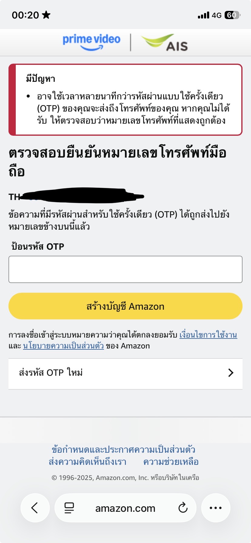 สมัคร Prime Video กับทาง AIS ไม่ได้รับ OTP ครับ