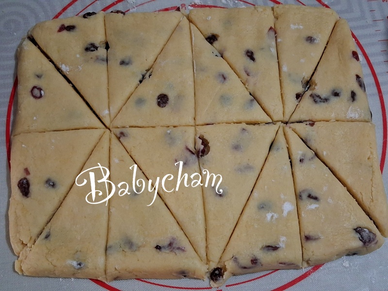 ครั้งนี้ก็ตัดสี่เหลี่ยมง่ายๆ ที่คนอังกฤษเห็นแบบนี้ ก็จะต้องโวยวายอีกแล้วว่า นี่ไม่ใช่สโคนแบบอังกฤษแล้วนะยูว์ ทำครั้งแรกๆ แม่เปปก็ทำตามต้นตำรับอังกฤษเป๊ะเลย แต่เวลาใช้วงแหวนกลมๆตัดแล้วมีเศษแป้งเหลือ ต้องมาเก็บรวบแป้งกดๆให้เป็นแผ่นเพื่อตัดใหม่อีกหลายครั้ง กว่าจะหมดก็มีหงุดหงิดเหมือนกัน แม่เปปเลยใช้วิธีลัด ตัดสี่เหลี่ยมทีเดียว ไม่ต้องมาเก็บเศษแป้งใดๆ ถือว่าสะดวกคนทำ