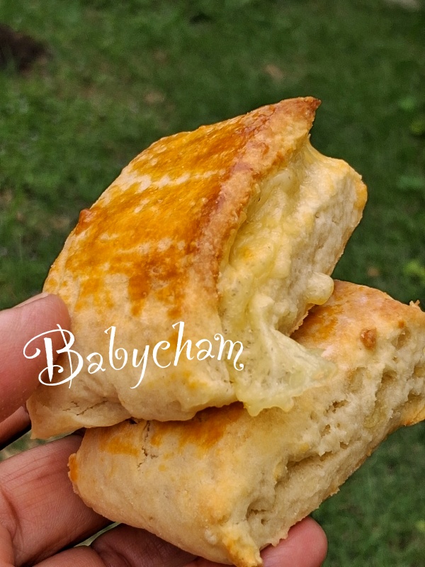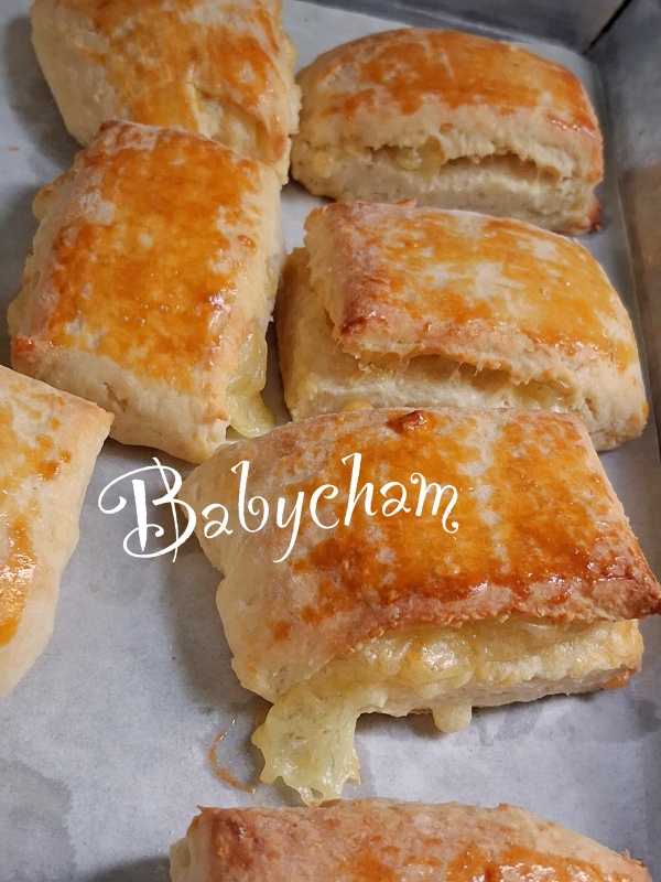 อบเสร็จ ก็ได้แบบนี้เลยค่ะ ฟูเป็นชั้นไหม ไม่ได้สนใจเลย เพราะแค่ส่วนผสมก็อร่อยเริ่ดแล้ว เหมือนกินขนมปังไส้แฮมชีสสไตล์คนไทยยังงั้นเลยค่ะ