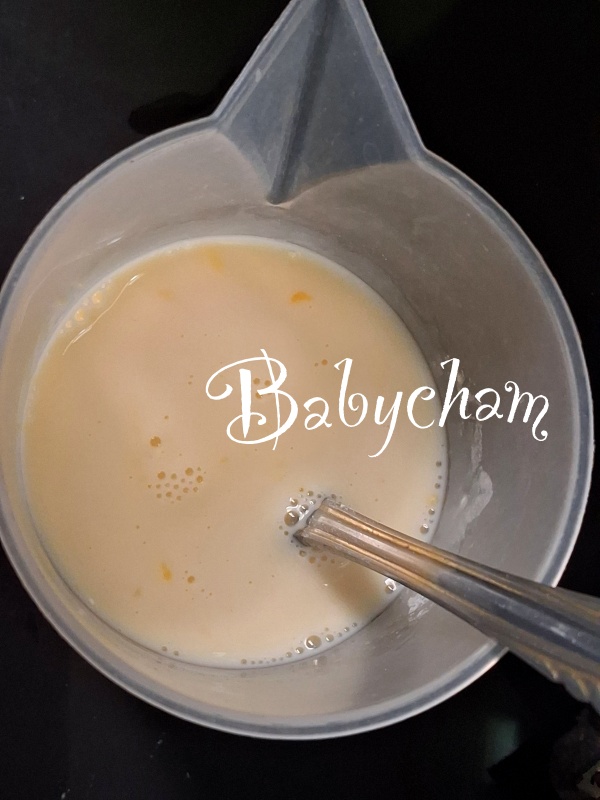 3. ไข่ไก่+นม ตีให้ไข่แตกและผสมเป็นเนื้อเดียวกับนม แล้วนำลงเทในชามผสมแป้ง