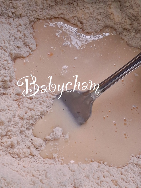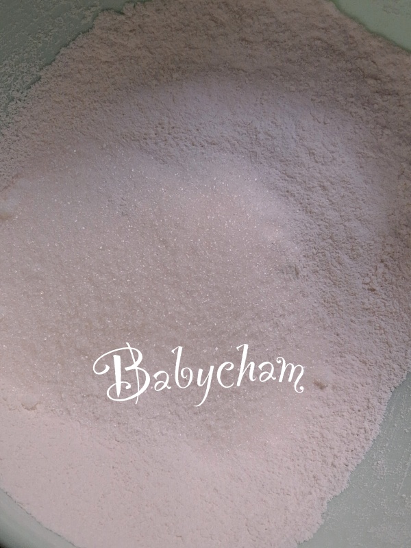 1. ในชามผสม ใส่แป้งสาลี(ร่อนแล้ว)+ผงฟู + น้ำตาลทราย +เกลือ ใช้ส้อมหรือตะกร้อมือคนผสมให้เข้ากัน