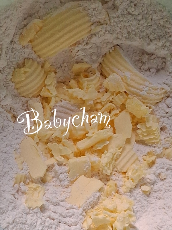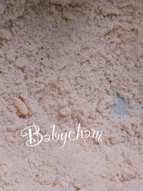 2. ใส่เนยสดลงในชามแป้ง แล้วใช้ส้อมหรือปลายนิ้ว ผสมให้เนยเข้ากันกับแป้ง ฝรั่งจะเปรียบเหมือนขนมปังป่น แต่คนไทยมองว่าเหมือนเม็ดทราย