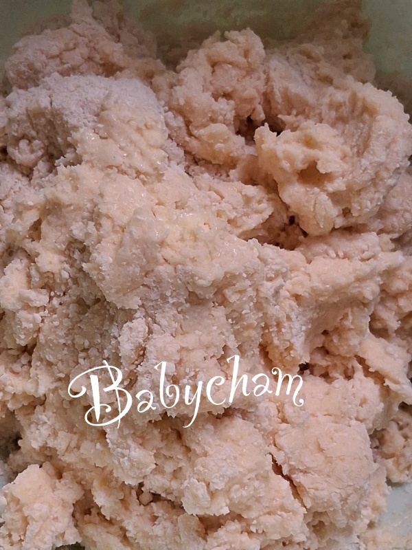 4. ใช้ส้อม หรือ ปลายนิ้ว ผสมให้ทุกอย่างรวมกัน แป้งที่ได้จะจับตัวกันเป็นก้อนเล็ก-ใหญ่ แป้งจะนิ่มมากๆ แต่ไม่มีความเหลวนะ