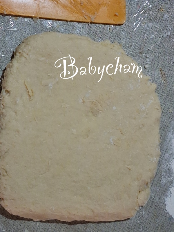 กดๆ เบามือโดยใช้แผ่นตัดแป้งช่วย จะต้องการเป็นรูปสี่เหลี่ยม หรือ วงกลมก็ตามชอบเลย แล้วตัดแป้งแบ่งครึ่งวางซ้อนกัน แล้วกดใหม่ให้แผ่ขยายออกไปเช่นเดิม ทำซ้ำๆ 2-3 รอบ เพื่อเวลาอบเขาจะฟูเป็นชั้นๆและจะเป็นรอยแตกตรงกลางให้ ต้องการสโคนหนา-บางแค่ไหน แล้วแต่ความชอบเลย