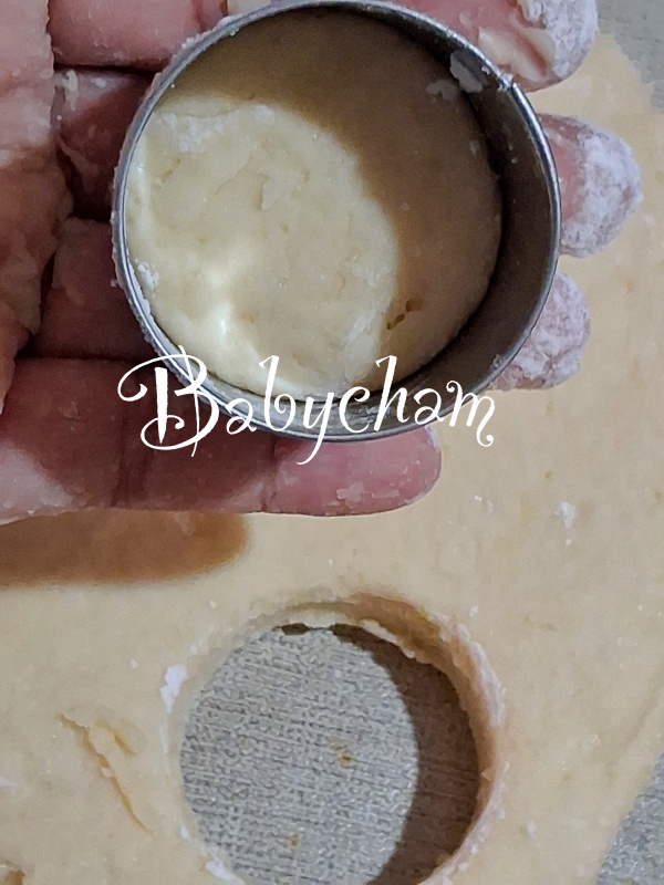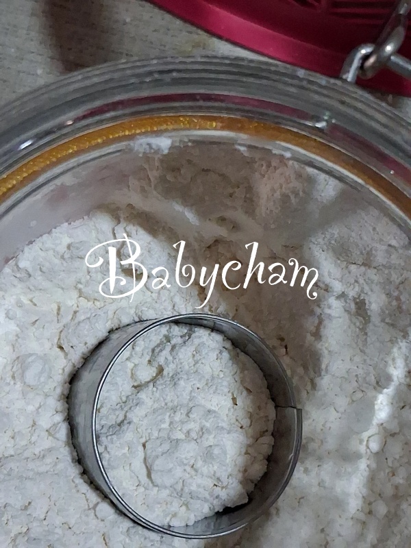 เทคนิคเล็กน้อยใช้เวลาตัดแป้ง คือใช้พิมพ์วงแหวนจุ่มลงในโหลแป้ง จุ่มแล้วก็สะบัดแป้งออกด้วยนะ จะช่วยให้ตอนตัดสโคนไม่ติดพิมพ์