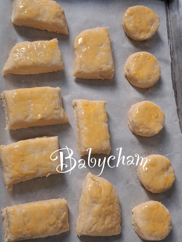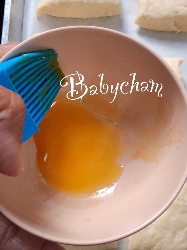 9. นำแป้งที่ตัดเป็นรูปทรงแล้ว(ห้ามตบแต่งแป้งด้านข้างใดๆ) วางในถาดอบ(ที่รองกระดาษรองอบไว้) ใช้แปรงทาไข่แดงลงบนหน้าขนม ก่อนนำเข้าอบ ใช้ไฟ 220 องศา 12-15 นาที โดยประมาณ (สโคน ใช้ไฟแรง อบระยะสั้น)