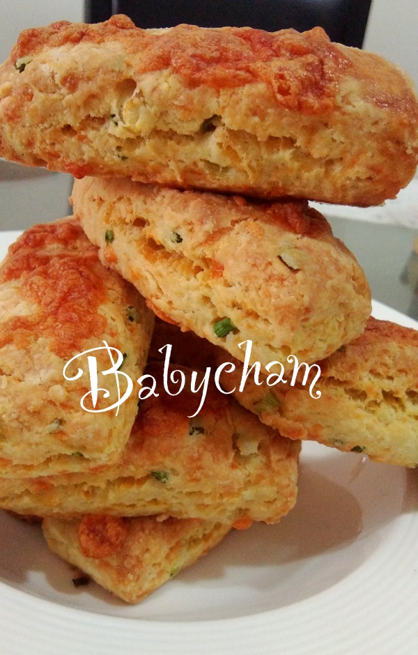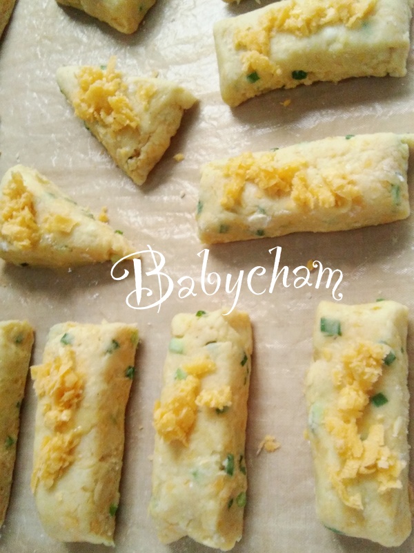 อันนี้ ใส่ต้นหอมซอย+พริกไทย ผสมลงในตัวสโคนด้วยค่ะ แล้วก็เพิ่มเชดดาร์ชีส แบบวางด้านบนล้วนๆ เลย ตัดสามเหลี่ยม สี่เหลี่ยม