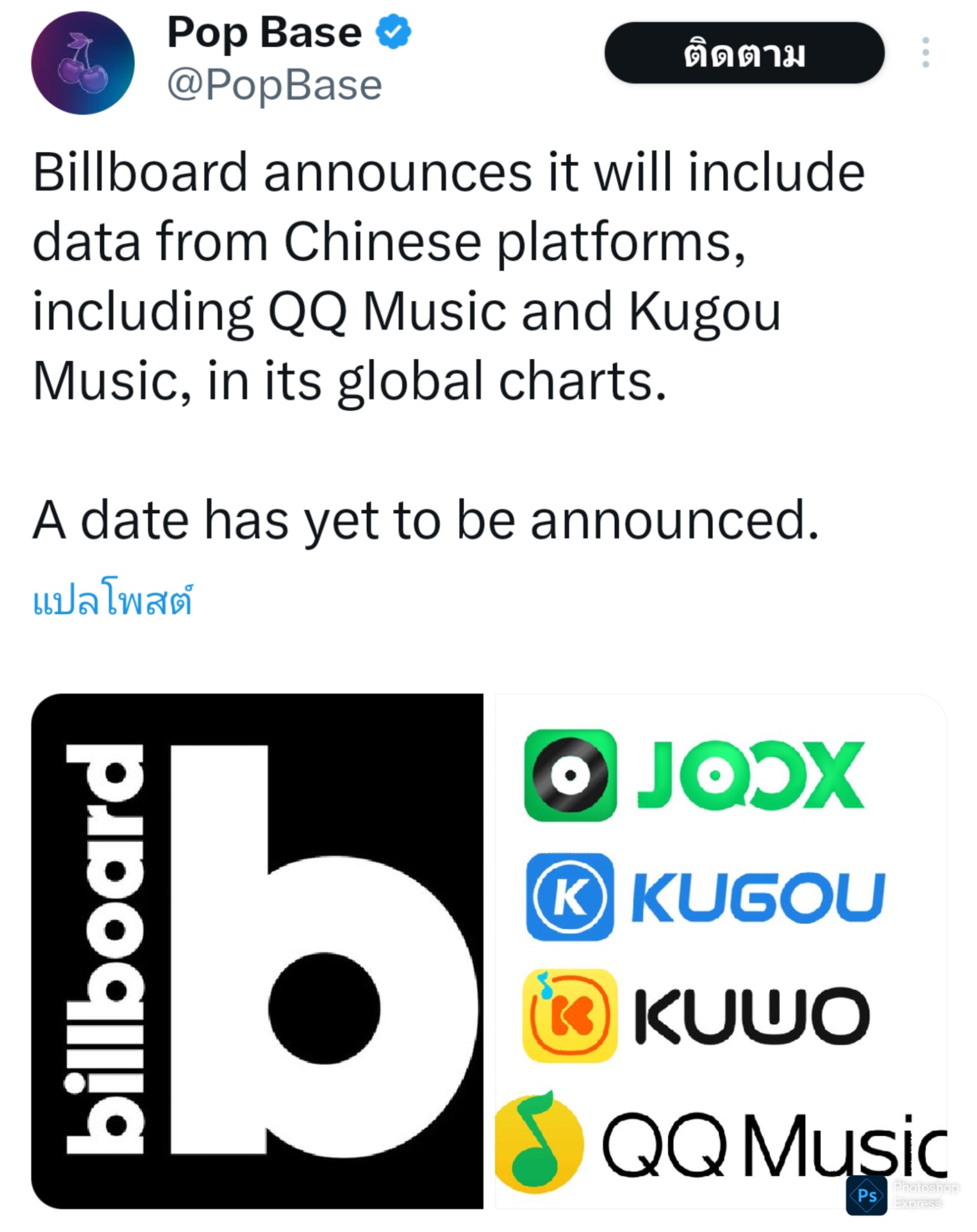Billboard ประกาศว่าจะนำข้อมูลจาก Music Platform ของจีนอย่างเช่น QQ Music และ Kugou Music เข้ารวมกับ Global Charts ด้วย
