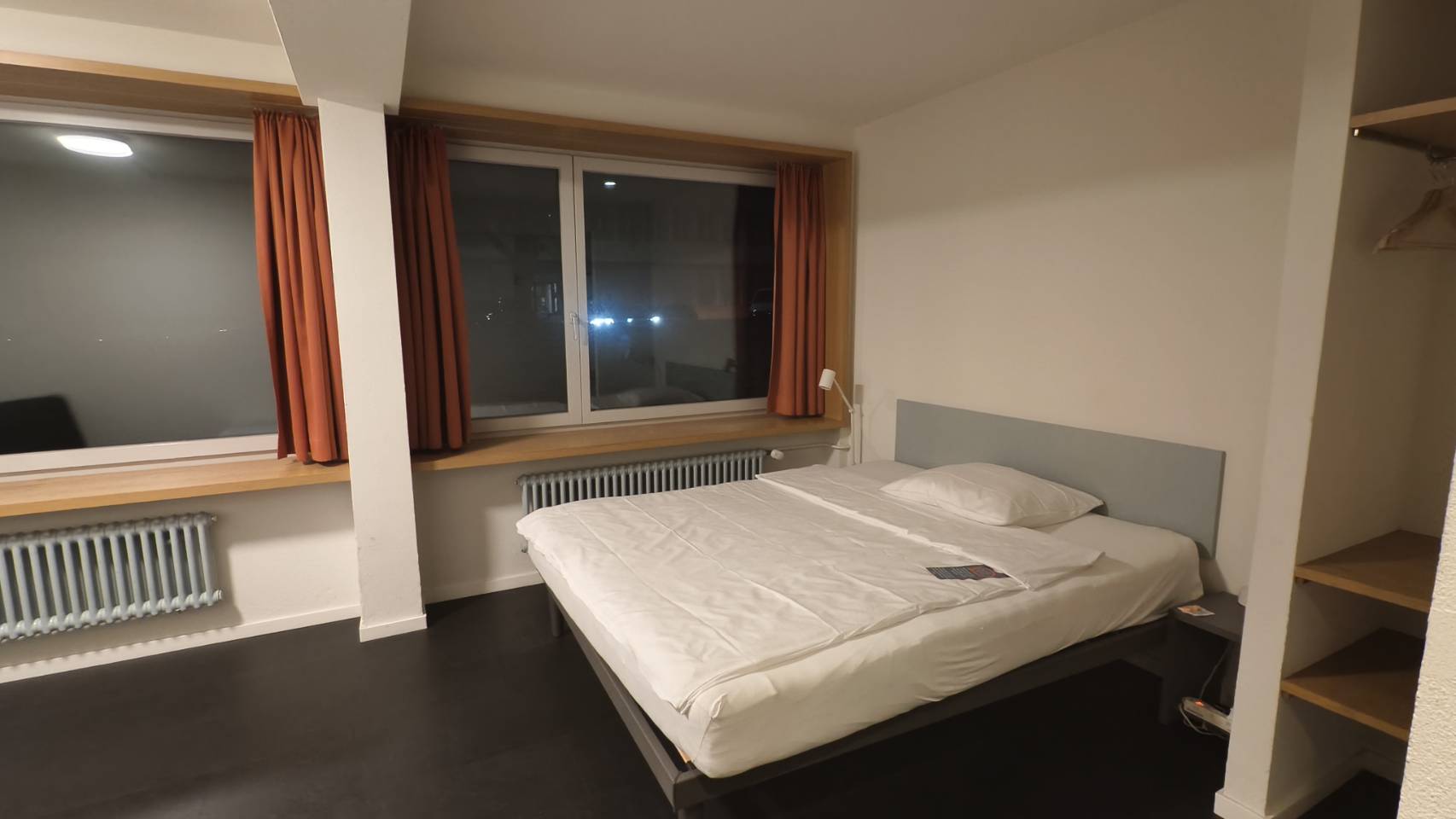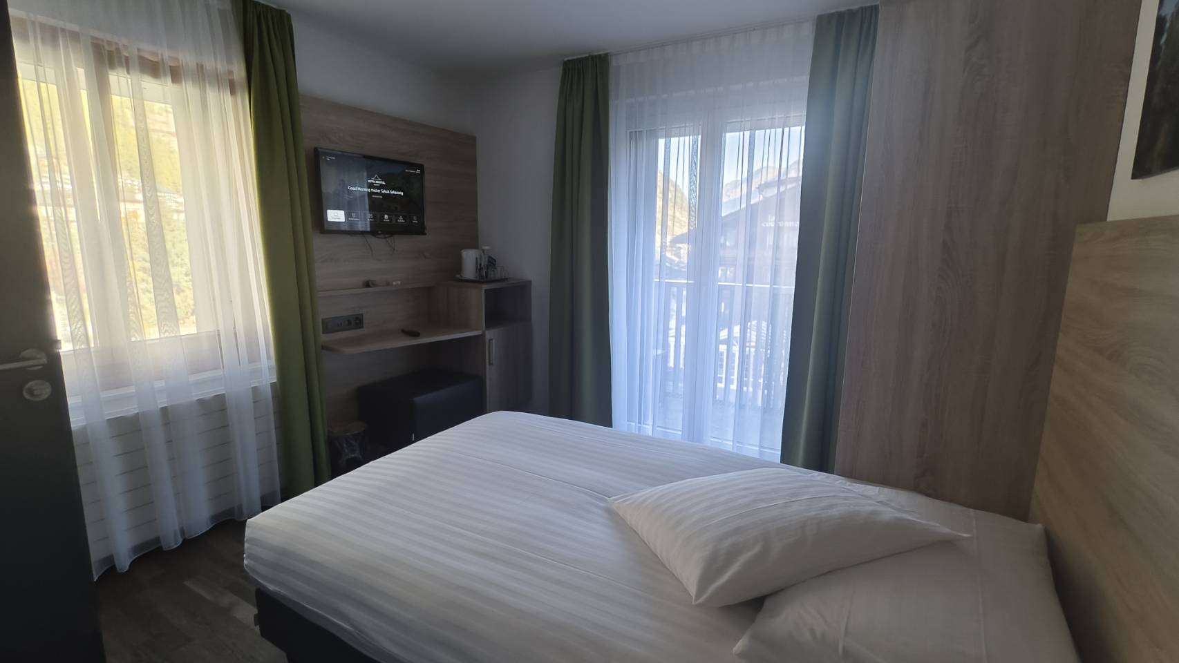 ห้องที่เลือกเป็นห้อง Grandlit คือเตียงมีขนาดใหญ่หน่อย ข้อดีอีกอย่างคือมี หน้าต่างสองด้านเพราะเป็นห้องมุม ห้องที่นี่ถือว่าราคาแรงสุดทั้งทริปแล้วครับ ประมาณ 8500 บาท ถามว่าเห็น Matterhornไหม ไม่จ้า ไม่ได้เห้นตรงๆ ห้องวิวที่เห็น Matterhorn ราคากระโดดไป หมื่นสี่ ถึงสองหมื่นจนน่าตกใจ แต่จากห้องของผมชะเง้อออกมุมข้าง ก็คือเห็น Matterhorn ได้เอียงๆ รวมถึงเซลฟี่ เห็นได้ชัดเจนเลย