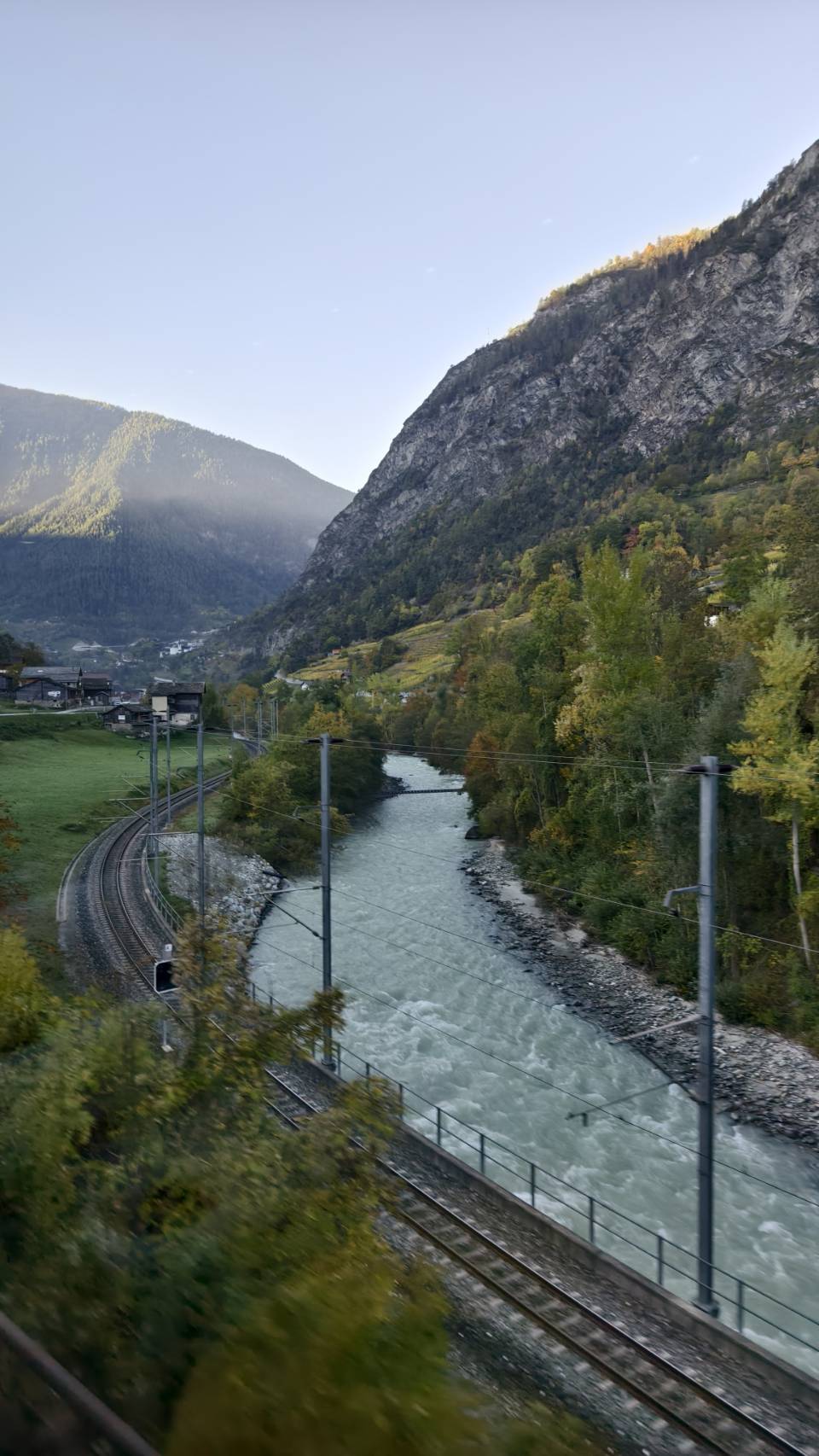 บรรยากาศ ระหว่างทาง สวยสุดบรรยาย แน่นอน แม้จะเห็นในรูปมาแล้วมากมาย แต่เห็นตัวตาเนื้อตัวเองมันว้าว กว่าจริงๆ เนื่องจากช่วงที่เดินทางเป็น Autumn ต้นไม้หลายๆต้นจึงเปลี่ยนเป็นสีเหลือง สีส้ม ตัดกับ พื้นหญ้าสีเขียว ยิ่งใกล้ Zermatt ก็ทำให้เราเห็นยอดเขาสูง ที่ปกคลุมไปด้วยหิมะสีขาว ตัดกับพื้นท้องฟ้าสีน้ำเงิน 3 ชม.ที่เดินทางมาคือไม่ได้นอนเลยครับและก็ไม่ได้รู้สึกว่ายาวนานเท่าไหร่ เพราะมัวแต่มองนู่นนี่ไปซะหมด