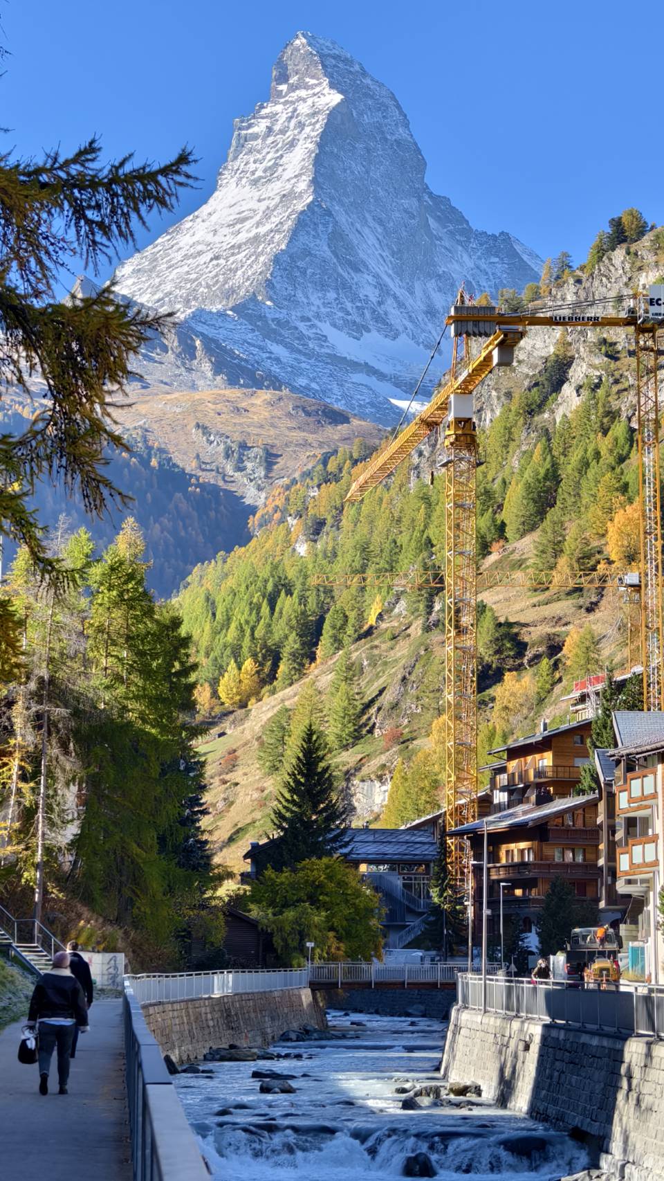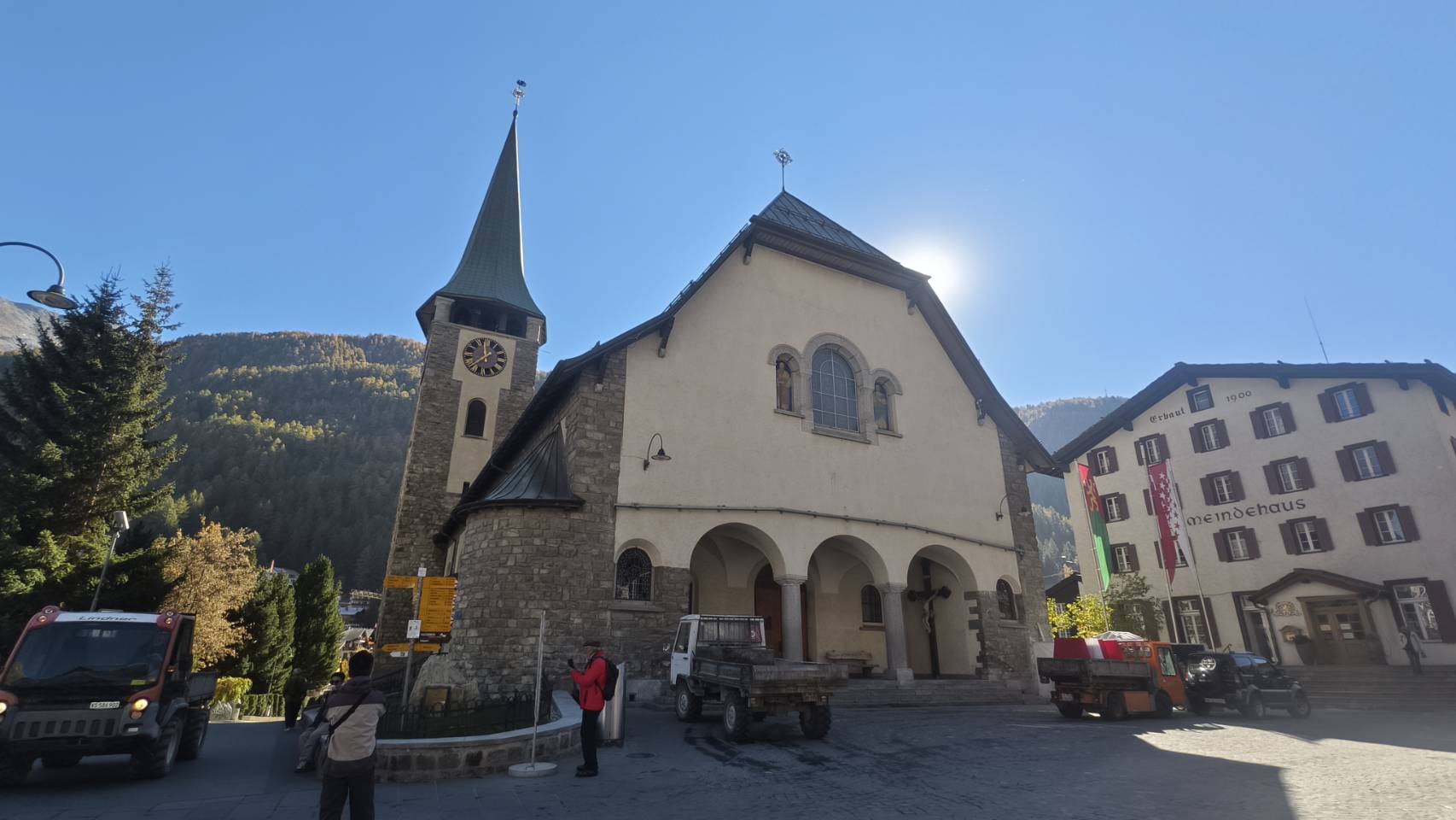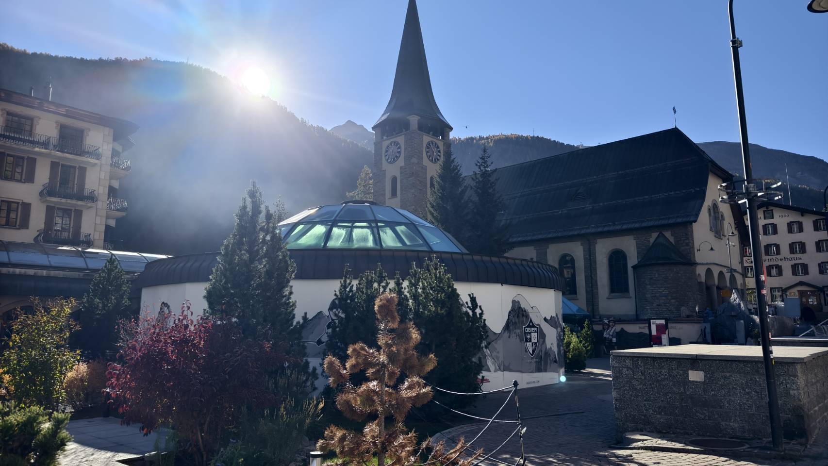 หลังจากเก็บข้าวของเสร็จ ก็แวะลงมาจุด วิวพอยต์ที่ถ่ายรูปสักหน่อย วันนี้โชคดีมากเหมือนที่ดุพยากรณ์ ท้องฟ้าสดใส เป็นสีฟ้า มองเห็นธารน้ำหน้าโรงแรม และวิวด้านหลังเป็น Matterhorn ซึ่งมีขนาดใหญ่กว่าที่คิดไว้มาก แม้จะเห็นจากรูปก็ดูงั้นๆ ภูเขาสามเหลี่ยม แต่พอมาเห็นจริงๆ มันดูยิ่งใหญ่ และแข็งแกร่งมากๆ เดินเก็บรูปสักพัก ก็มาเดินเล่นตรงโบสถ์กลาง Zermatt