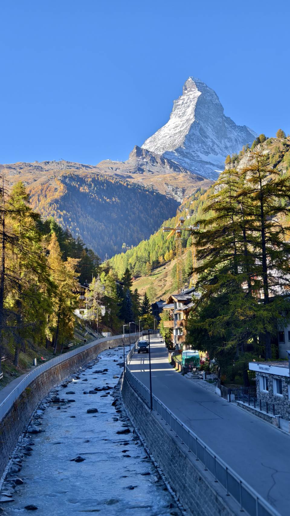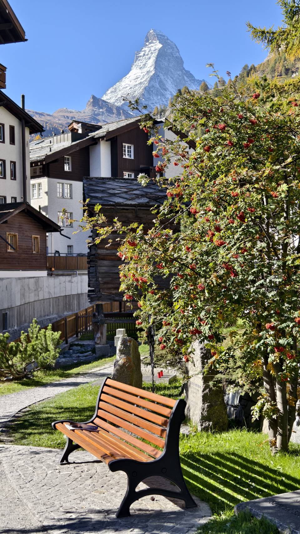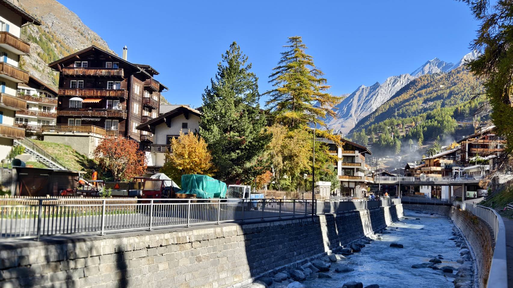 หลังจากเก็บข้าวของเสร็จ ก็แวะลงมาจุด วิวพอยต์ที่ถ่ายรูปสักหน่อย วันนี้โชคดีมากเหมือนที่ดุพยากรณ์ ท้องฟ้าสดใส เป็นสีฟ้า มองเห็นธารน้ำหน้าโรงแรม และวิวด้านหลังเป็น Matterhorn ซึ่งมีขนาดใหญ่กว่าที่คิดไว้มาก แม้จะเห็นจากรูปก็ดูงั้นๆ ภูเขาสามเหลี่ยม แต่พอมาเห็นจริงๆ มันดูยิ่งใหญ่ และแข็งแกร่งมากๆ เดินเก็บรูปสักพัก ก็มาเดินเล่นตรงโบสถ์กลาง Zermatt