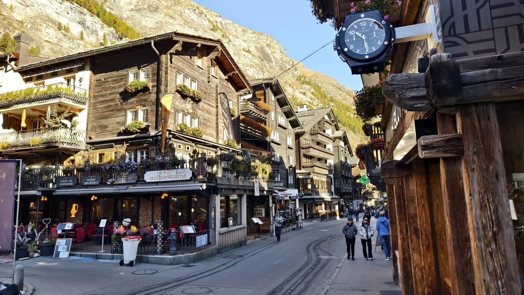ใกล้ๆ สิบเอ็ดโมงผมก็เดินทางถึง Zermatt ผมลากระเป่าเดินทางมาเรื่อยตามทาง ตามสไตล์ทางเดินยุโรปบางส่วนมักเป็นพวก Cobble stone แน่นอน มัน ไม่ค่อยเป็นมิตรกับล้อกระเป๋าเท่าไหร่นัก สงสัยกระเป๋าคู่บุญมาก มารู้อีกที่รร.มีรถรับส่งนะ แต่ ช้าไปละจ้า
