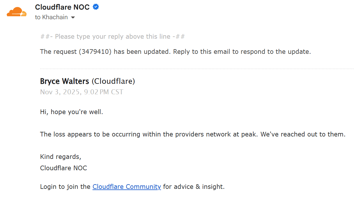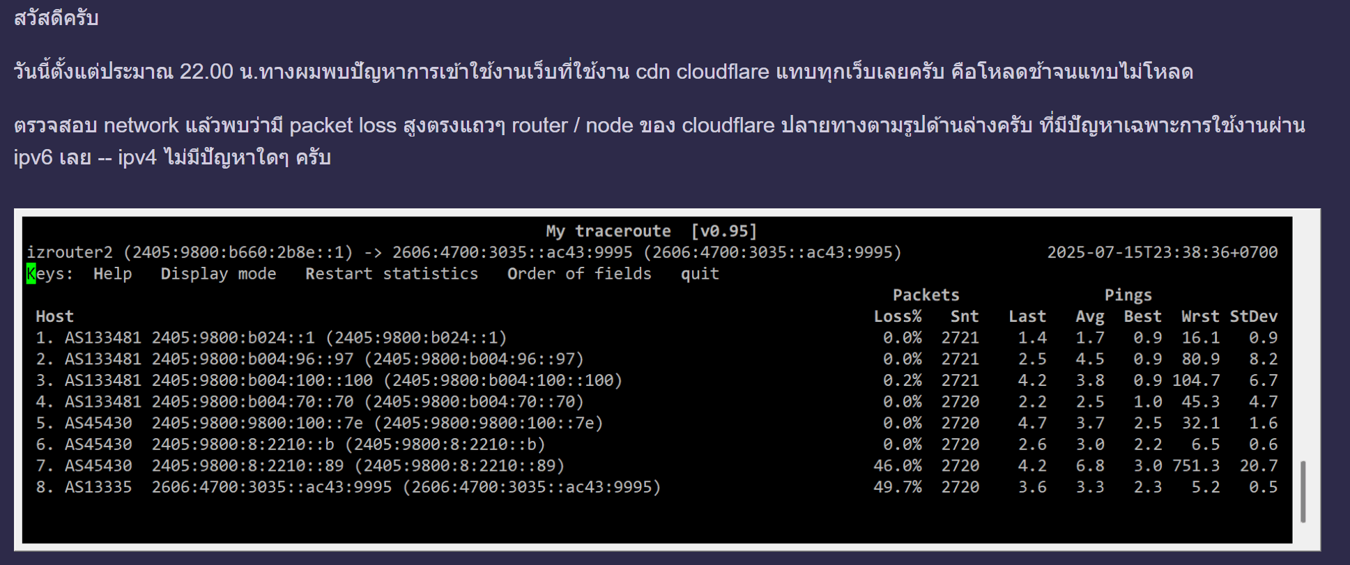 นอกจากนี้ก็มีการประสานงานไปทาง cloudflare แล้ว ทาง cloudflare แจ้งว่าเป็นปัญหาจากภายในของ AIS เอง