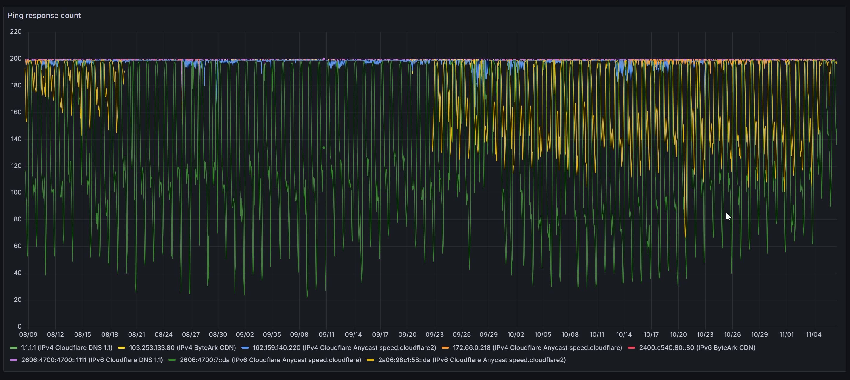 ซึ่งตั้งแต่ที่แจ้งไป ทางผมก็ทำ monitor เพิ่มเติมไว้ที่บ้าน เพื่อวัดปริมาณ packet loss ของการเชื่อมต่อหา cloudflare เทียบกับเส้นทางอื่นๆ ก็เห็นอยู่ว่ามีปัญหาแค่การเชื่อมต่อไปหา cloudflare เท่านั้นเลย (เส้นเขียว + เหลืองที่ร่วงลงมาหนักๆ -- ส่วนเส้นอื่นคือ ipv4 หรือ ipv6 ของ provider อื่นๆ)