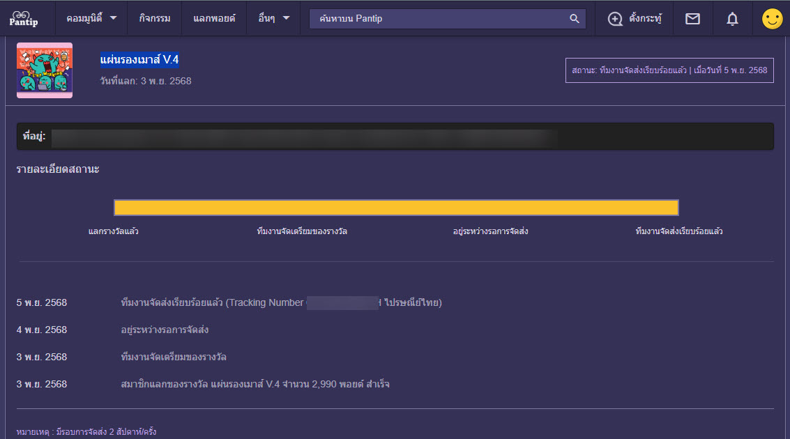 กดแลกคะแนนไปเมื่อวันที่ 3/11/2568 ของมาส่งวันที่ 5/11/2568 เร็วมากๆ