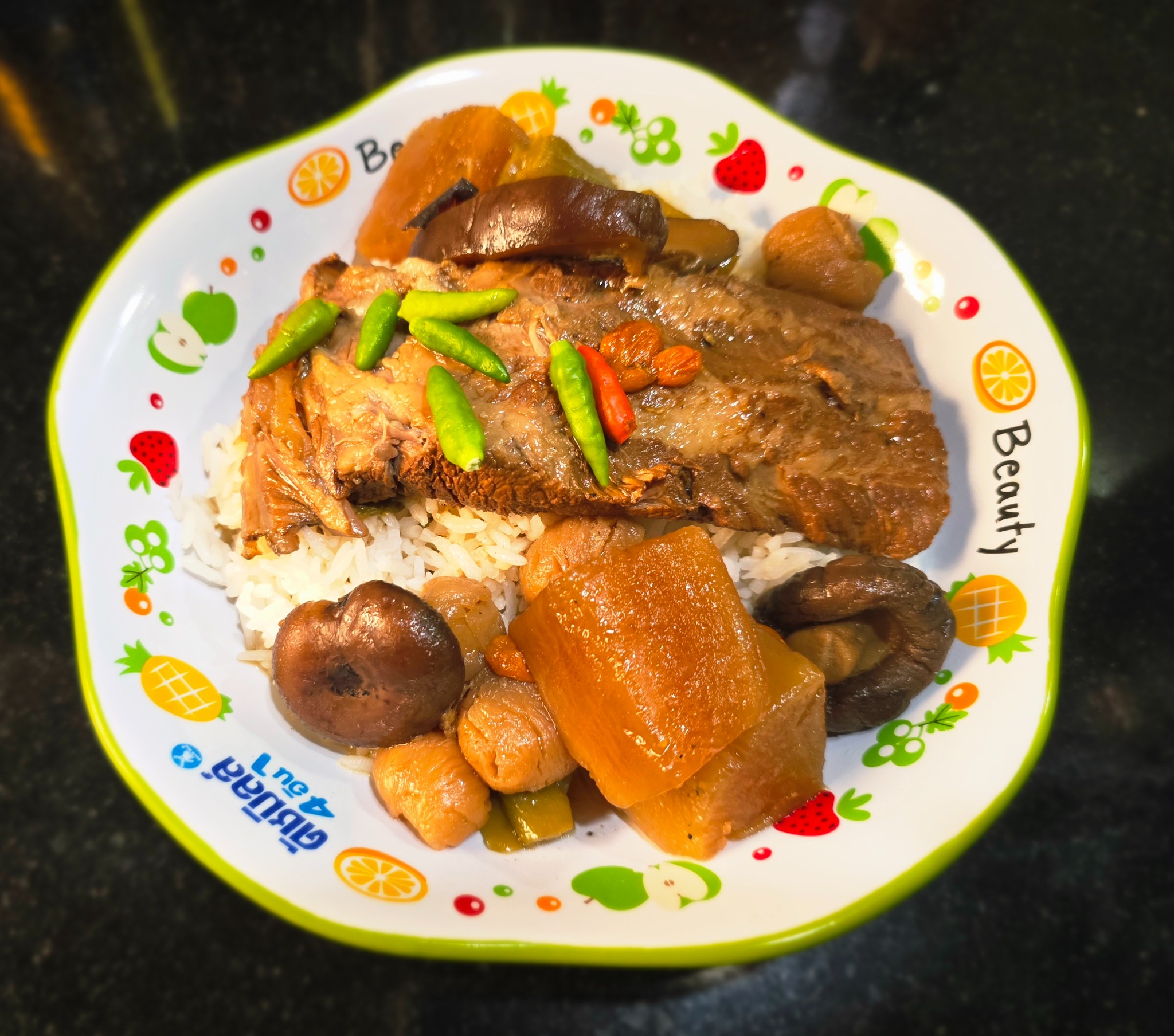 มีพุทราจีน ใส่ลงไปให้น้ำหวานอ่อนๆ ผมทำหม้อใหญ่ เลยเอาน้ำตาลมะพร้าวใส่ลงไปอีกนิดหน่อย ใช้ซีอิ๊วดำหวานอีก 3 ช้อนโต๊ะ รวมๆ แล้วหวานอ่อนๆ พอ แต่งรสเค็มด้วยดอกเกลือกับซีอิ๊วขาว นิดหน่อย
