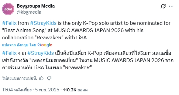 🔥 Stray Kids Felix K-Pop เดี่ยวคนเดียวที่ได้รับการเสนอชื่อเข้าชิงรางวัล "Best Anime Song" ในงาน MUSIC AWARDS JAPAN 2026