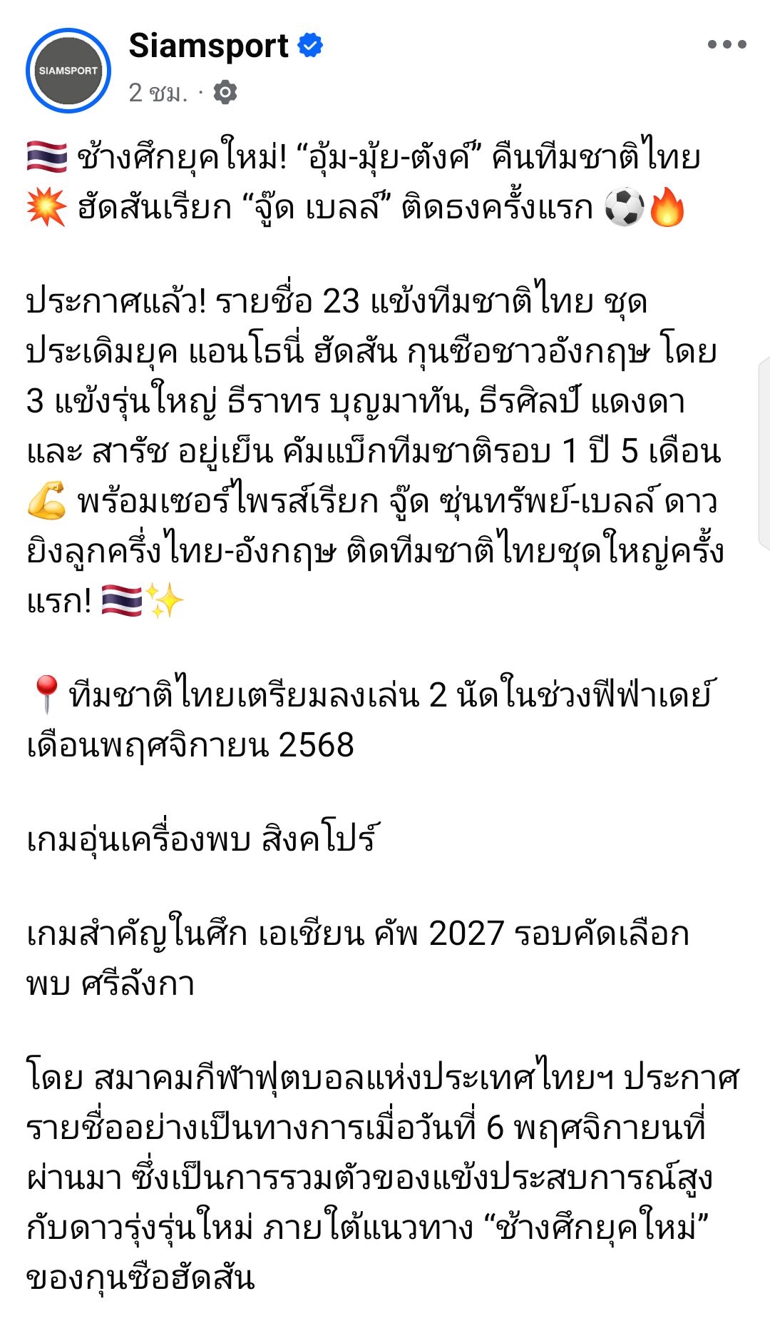 🇹🇭 ช้างศึกยุคใหม่! “อุ้ม-มุ้ย-ตังค์” คืนทีมชาติไทย 💥 ฮัดสันเรียก “จู๊ด เบลล์” ติดธงครั้งแรก!