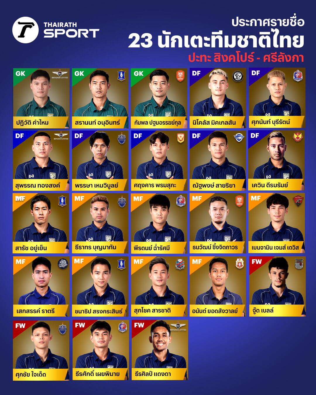 ประกาศรายชื่อ 23 นักเตะทีมชาติไทย ชุดเตรียมปะทะ สิงคโปร์-ศรีลังกา