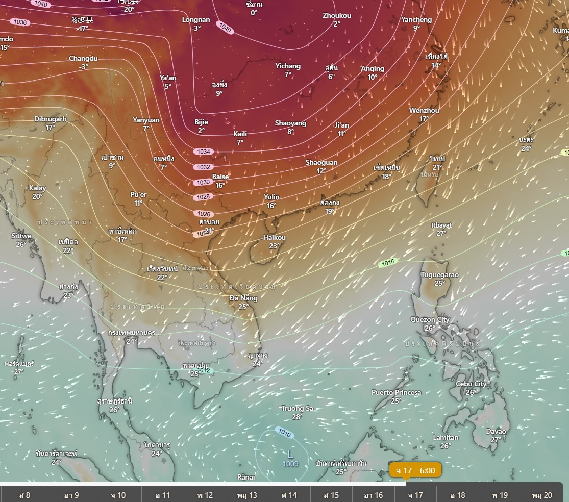 ระหว่างนั่งดูสถานการณ์พายุคัลแมกีแล้ว ก็ไปดูผลการพยากรณ์ในอนาคตก็พบว่าจะมีมวลอากาศเย็นกำลังแรงเลยทีเดียวแผ่ลงมาในช่วงหลังวันที่ 15 พฤศจิกายน 2568