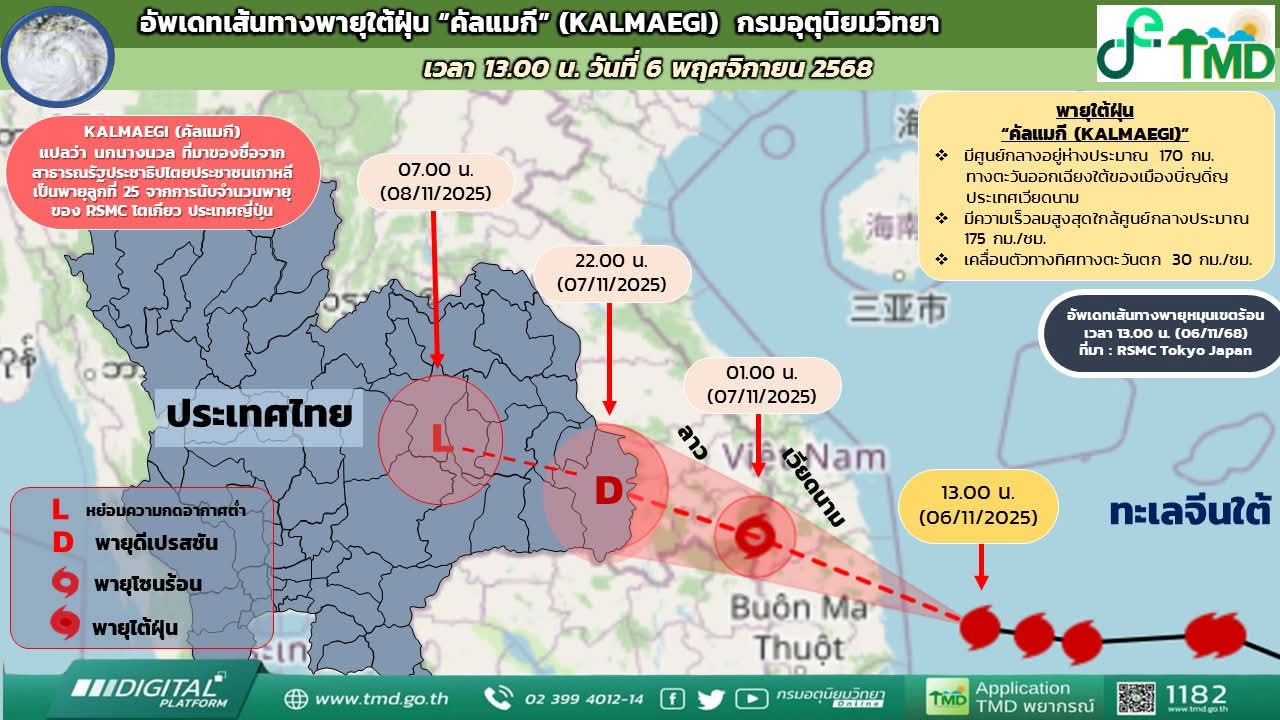 เมื่อเวลา 13.00 น. ของวันนี้ (6 พ.ย. 68) พายุไต้ฝุ่น “คัลแมกี” (KALMAEGI) บริเวณทะเลจีนใต้ มีศูนย์กลางอยู่ห่างประมาณ 170 กิโลเมตร ทางตะวันออกเฉียงใต้ของเมืองบิ่ญดิ่ญ ประเทศเวียดนาม หรือที่ละติจูด 13.3 องศาเหนือ ลองจิจูด 110.7 องศาตะวันออก ความเร็วลมสูงสุดใกล้ศูนย์กลางประมาณ 175 กิโลเมตรต่อชั่วโมง กำลังเคลื่อนตัวทางทิศตะวันตก ด้วยความเร็วประมาณ 30 กิโลเมตรต่อชั่วโมง คาดว่าจะเคลื่อนขึ้นฝั่งบริเวณเมืองบิ่ญดิ่ญ ประเทศเวียดนามตอนกลางในคืนวันนี้ หลังจากนั้นจะอ่อนกำลังลงเป็นพายุโซนร้อนและพายุดีเปรสชันเคลื่อนผ่านประเทศลาว โดยในวันที่ 7 พ.ย. 68 จะเคลื่อนเข้าปกคลุมบริเวณจังหวัดอุบลราชธานี ก่อนจะอ่อนกำลังลงเป็นหย่อมความกดอากาศต่ำกำลังแรงตามลำดับ