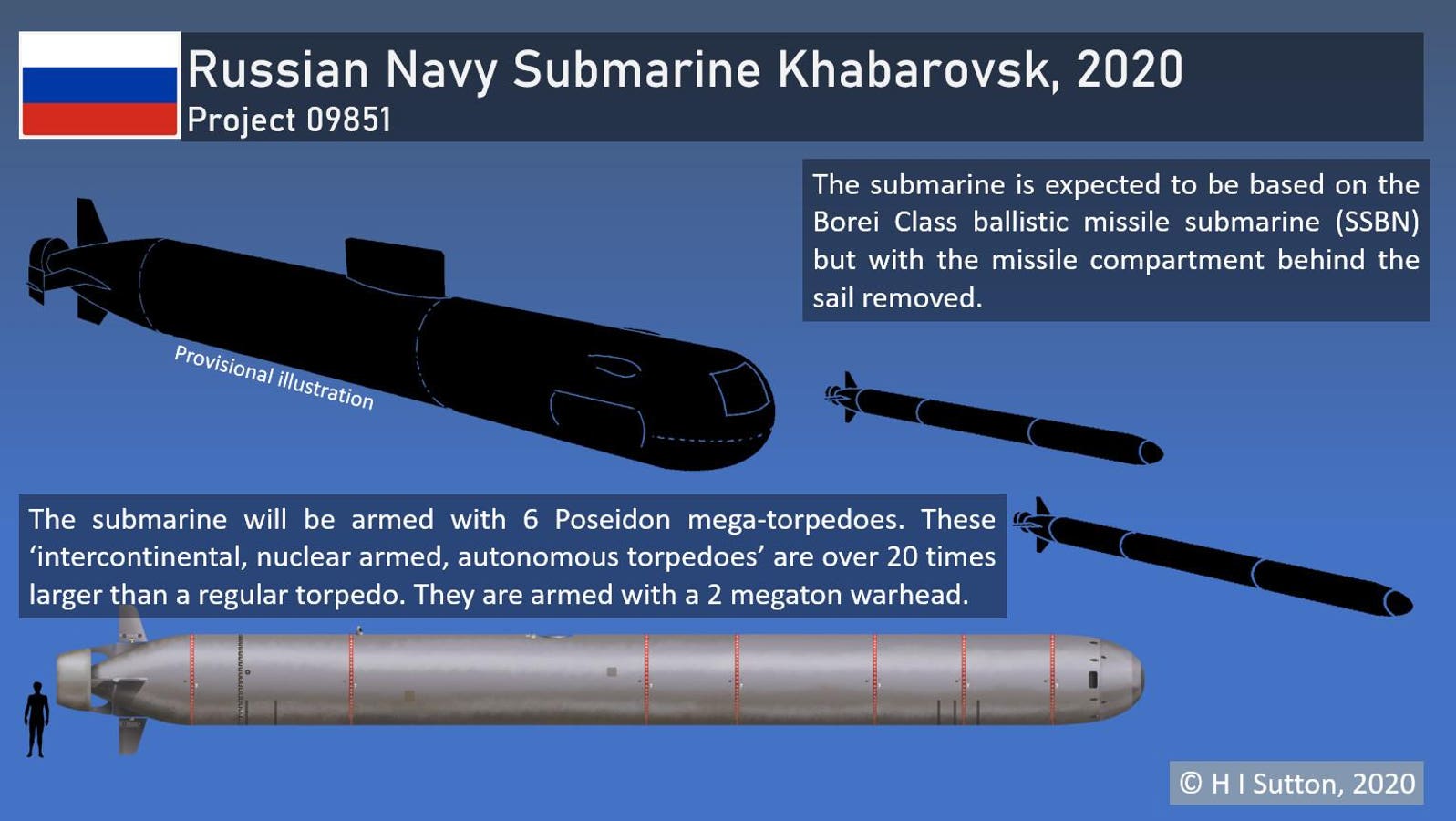 เรือดำน้ำ Khabarovsk มีภารกิจหลักคือการติดตั้งขีปนาวุธโพไซดอน เรือดำน้ำลำนี้สามารถดำน้ำได้ลึกประมาณ 500 เมตรและอยู่ใต้ผิวน้ำได้นานถึง 120 วัน คาดการณ์ว่า เรือดำน้ำ Khabarovsk จะเริ่มประจำการในกองเรือแปซิฟิกในฐานะส่วนหนึ่งของกองเรือดำน้ำภารกิจพิเศษในกองทัพเรือรัสเซียราวๆปีพ.ศ.2569 ถึงพ.ศ. 2570