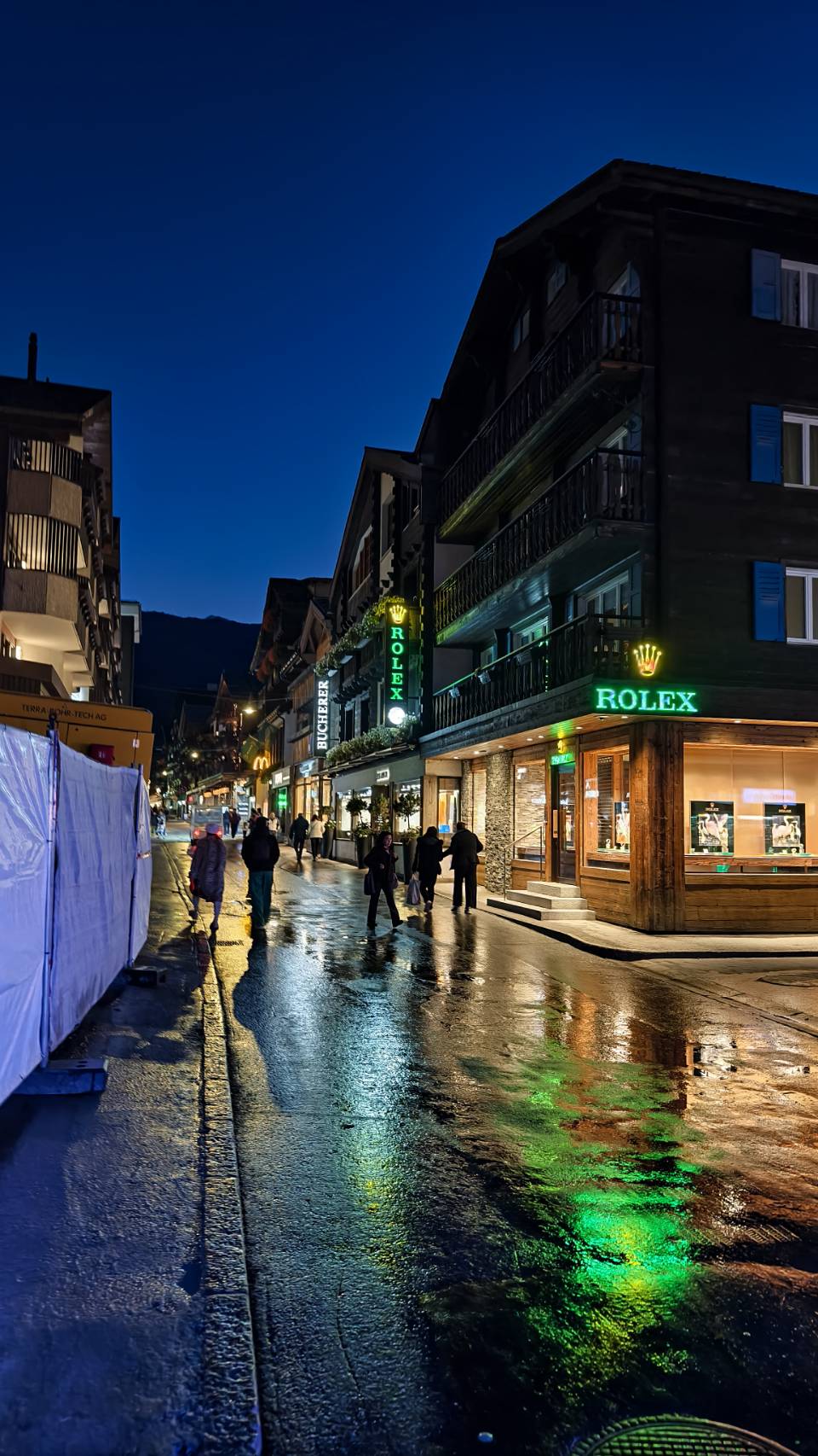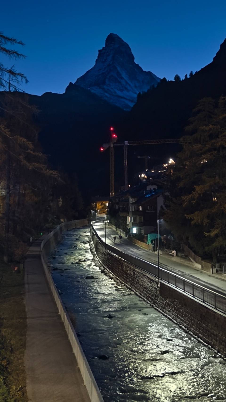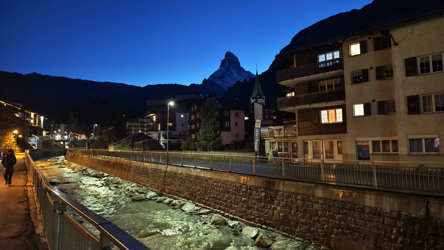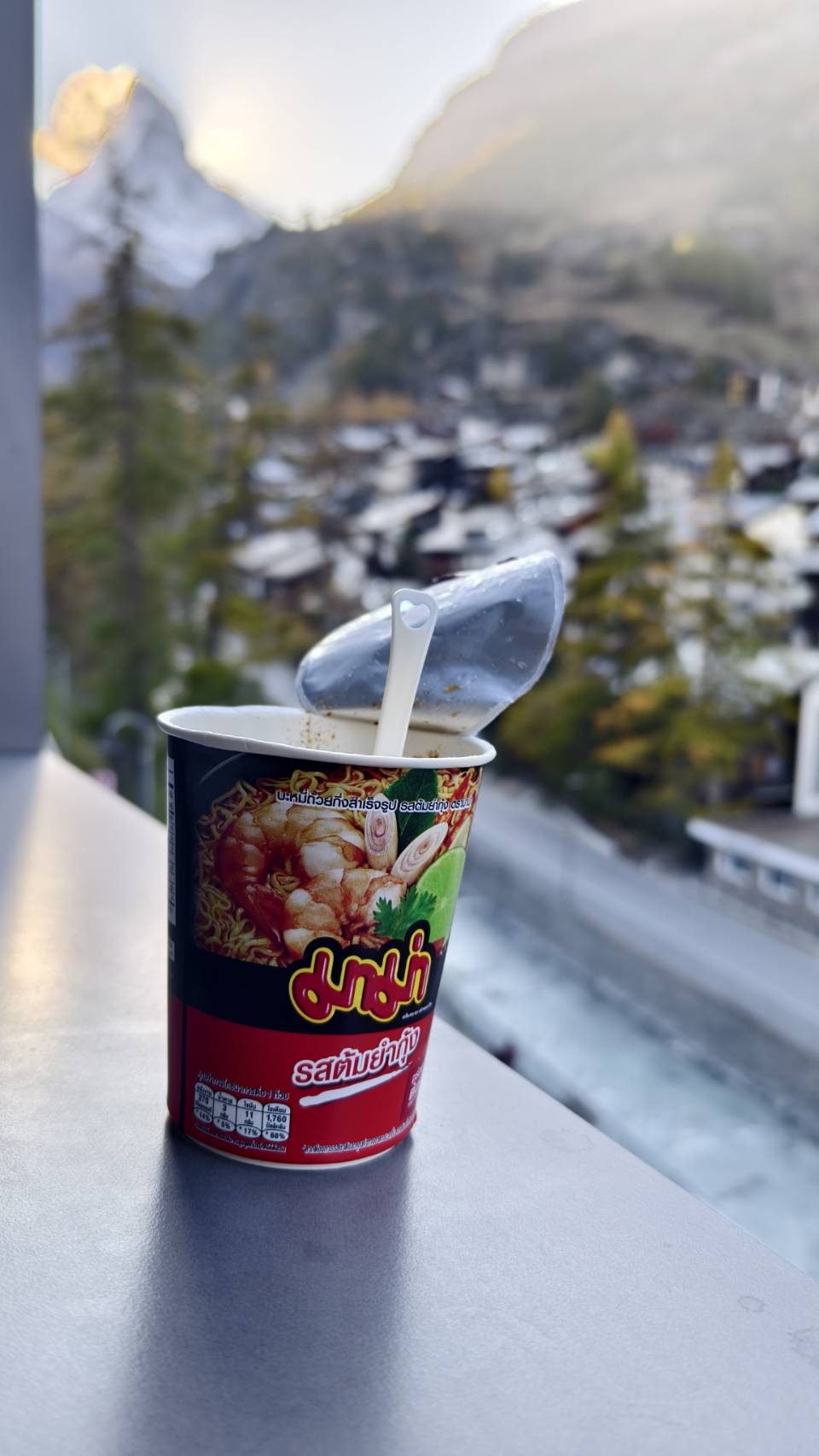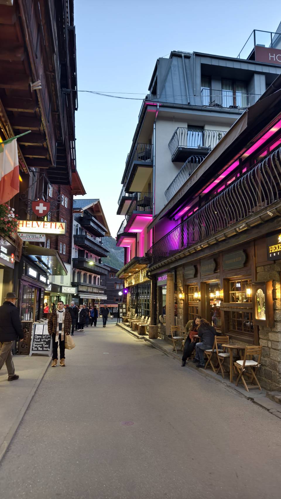 ช่วงเย็น Matterhorn ไม่ได้สวยงามเหมือนตอนเช้า หากแต่แสงอาทิตย์หลบอยู่ด้านหลังย้อนให้เห็น เหมือนรัสมีออกมาจากตัวเขา ดูสวยงามไปอีกแบบ หลังจากนั้นมาเดินเล่น ดูบรรยากาศในเมือง ซึ่งไม่ได้คึกคักสักเท่าไหร่ แต่ร้านอาหารเปิดให้นั่งทานหลายร้าน แต่เนื่องจากมีความมื่อยมาก จึงตัดสินใจแวะซื้อไก่ย่างมานั่งกินกับมาม่ากระป๋องที่ 2ของเรา จริงๆมีร้านอาหารที่อยากทานอยู่นะคับ ชื่อ Grumpi หลายคน รีวิวดีเลยทีเดียวแต่กว่าร้านจะเปิดก็ หกโมง หกโมงครึ่งตอนนั้นเพิ่งลงจากเขาคือหิวมากๆแล้วครับ พอกินเสร็จเลยอิ่มเกิน และไปเดินเล่นในเมืองเพื่อดูสีสรรแทน