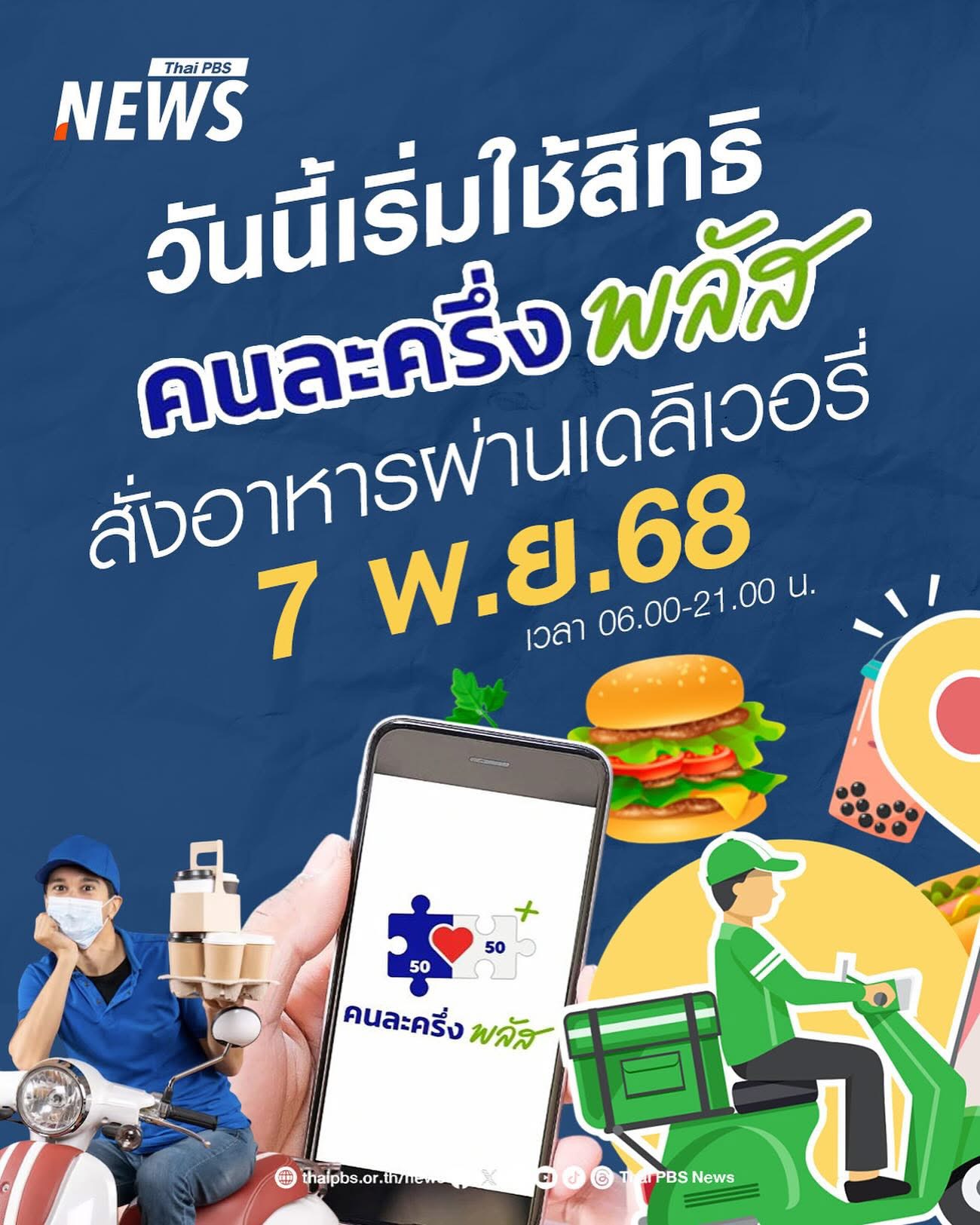 7 พ.ย.2568 เริ่มใช้สิทธิโครงการคนละครึ่งพลัสสำหรับสั่งออเดอร์ผ่านฟู้ดเดลิเวอรี่ ผ่าน 4 แอปฯ ตั้งแต่เวลา 06.00 - 21.00 น. และสิ้นสุดโครงการในวันที่ 31 ธ.ค.2568