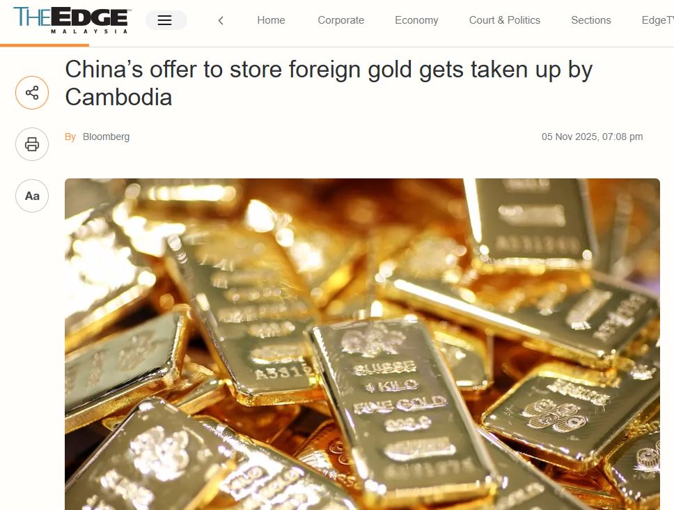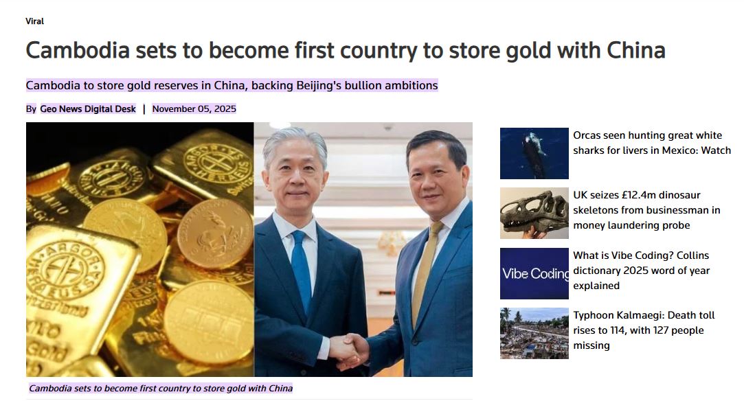 ข่าว 4 พฤศจิกายน 2568 / กัมพูชาได้บรรลุจุดหมายสำคัญในระบบการเงินโลก ด้วยการเป็นหนึ่งในประเทศแรกๆ ที่ยอมรับข้อเสนอของจีนในการส่งคืนทองคำสำรองต่างประเทศ ซึ่งถือเป็นชัยชนะครั้งแรกของปักกิ่งในการสถาปนาตนเองให้เป็นศูนย์กลางสำคัญในตลาดทองคำแท่งของโลก