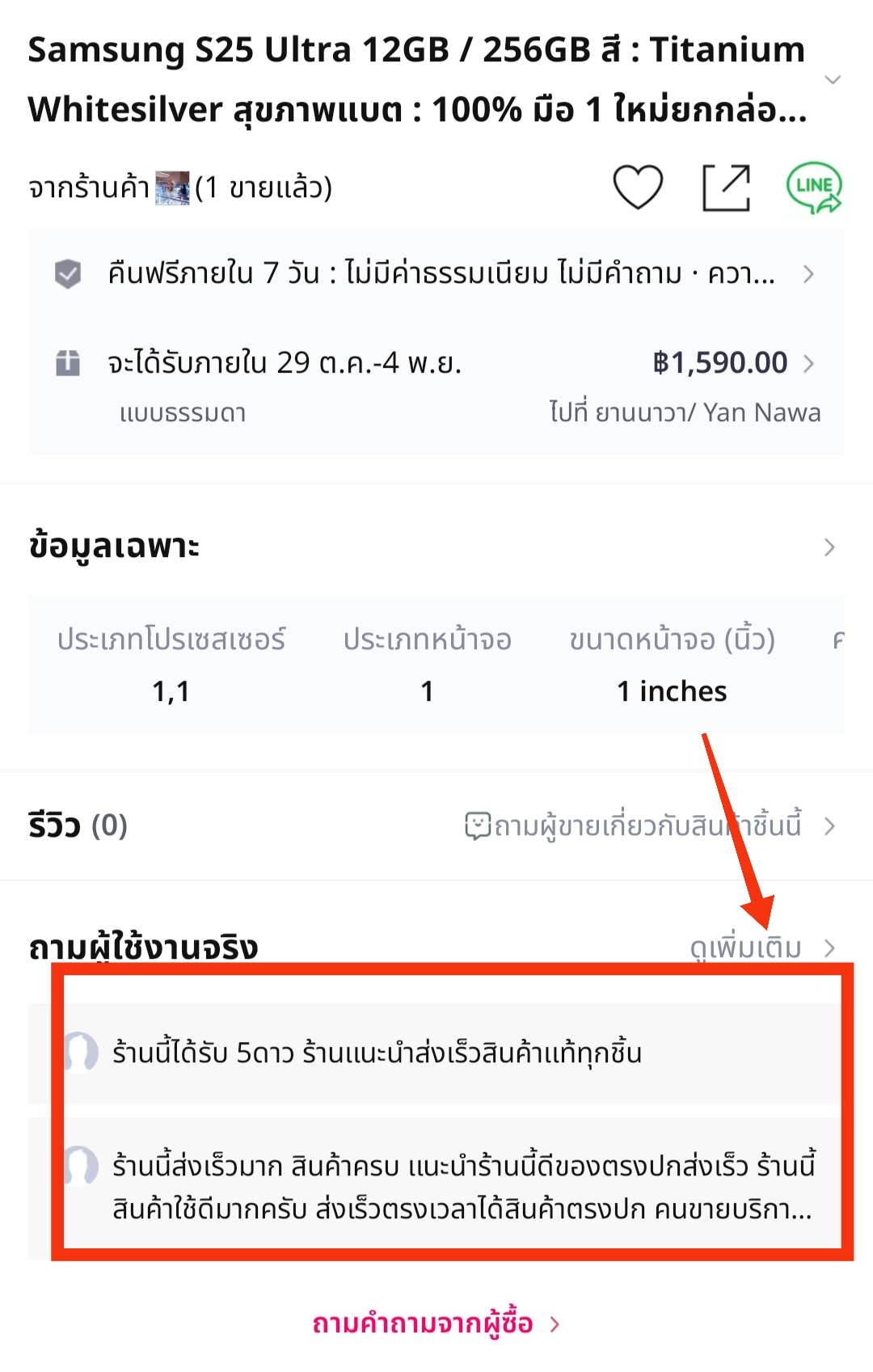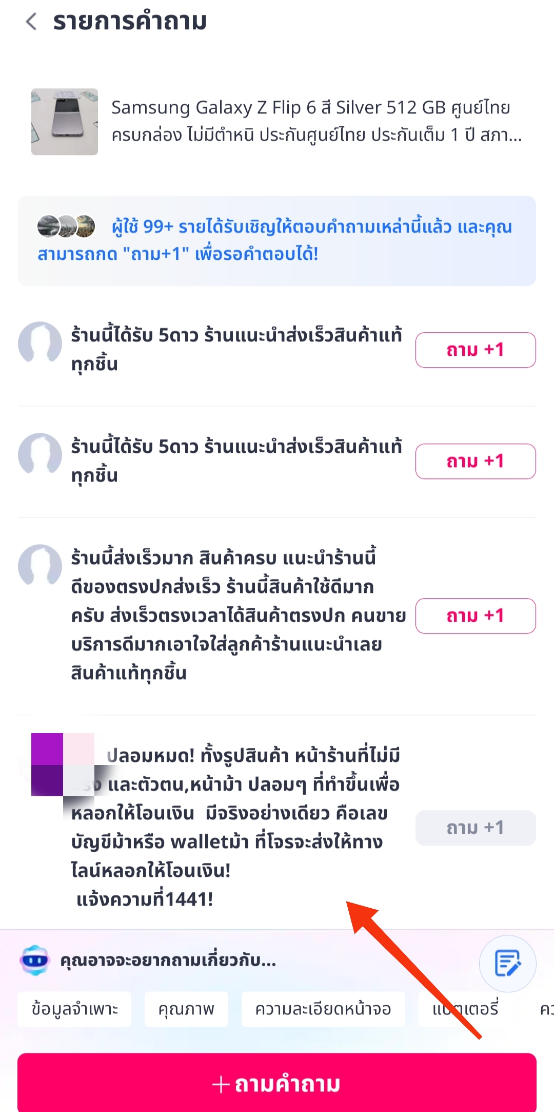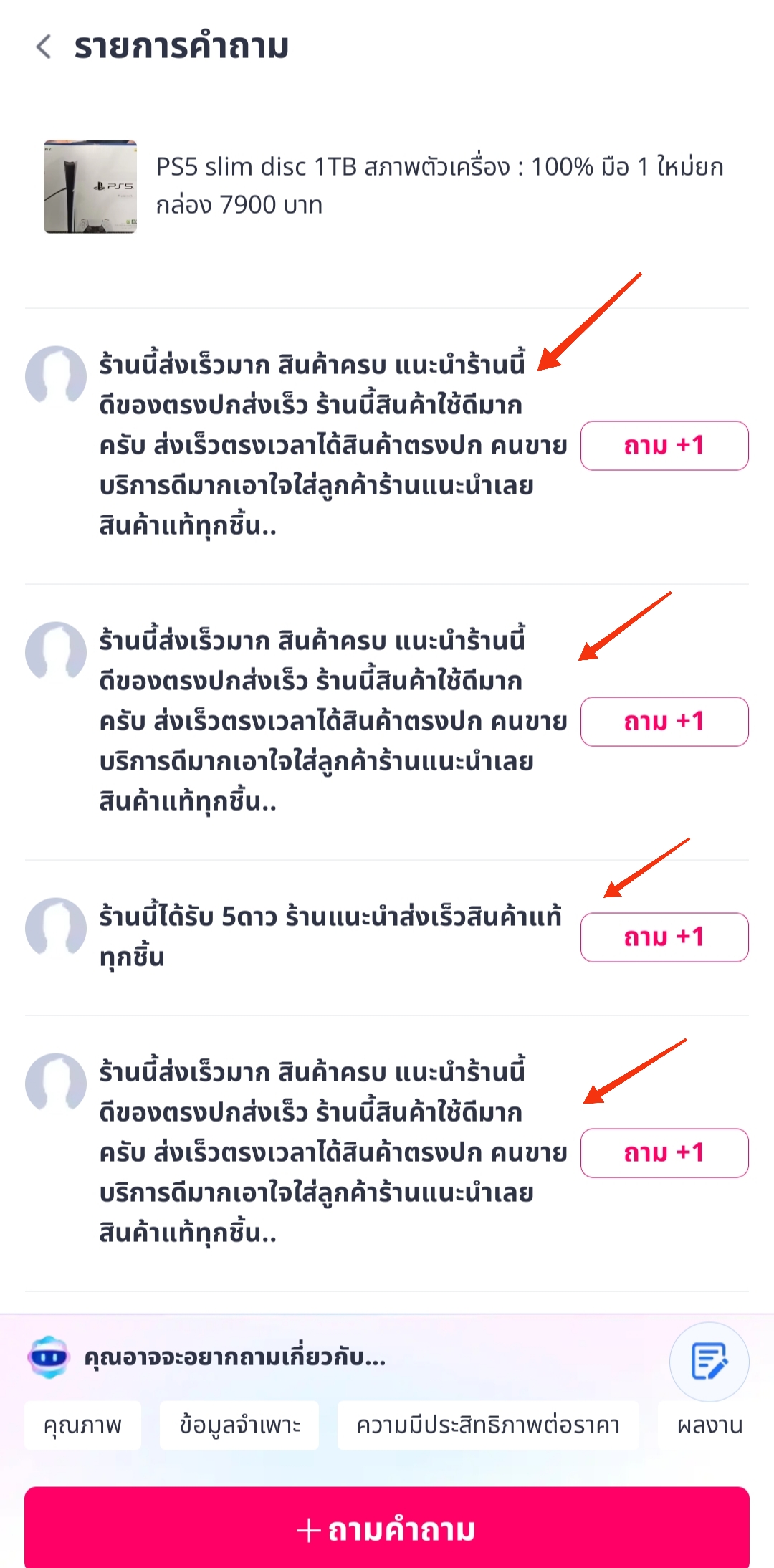 ซึ่งถ้าสังเกตุดีๆ จะพบว่า ไม่มีการรีวิวสินค้าจริงจากผู้ซื้อในช่องรีวิวเลย!! แต่ ในช่อง "ถามคำถาม" จะพบหน้าม้า คอยโพสต์ ปกปิด