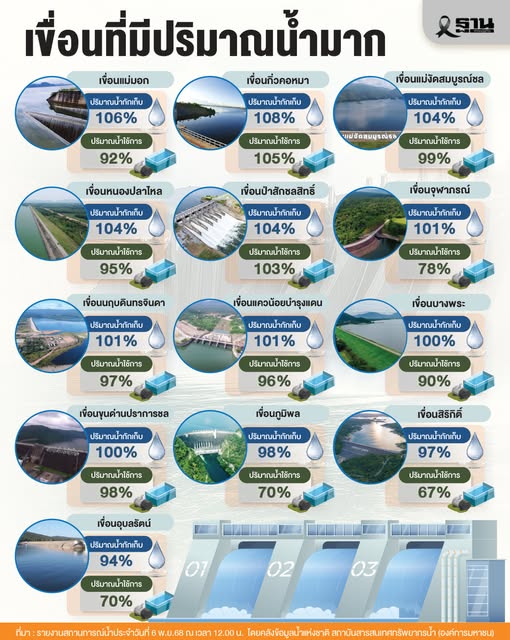 โดยระบุถึงในแม่น้ำสายหลักและอ่างเก็บน้ำขนาดใหญ่ทั่วประเทศ ณ เวลา 12.00 น. ของวันที่ 6 พฤศจิกายน 2568