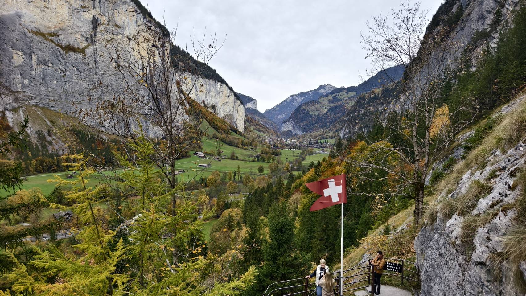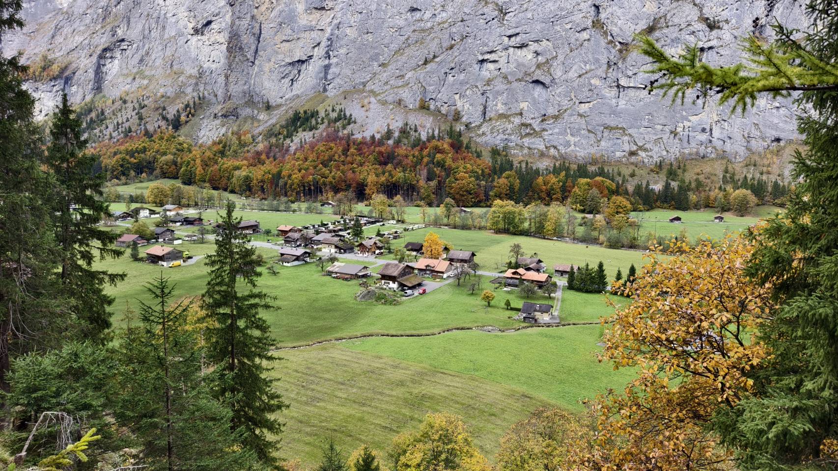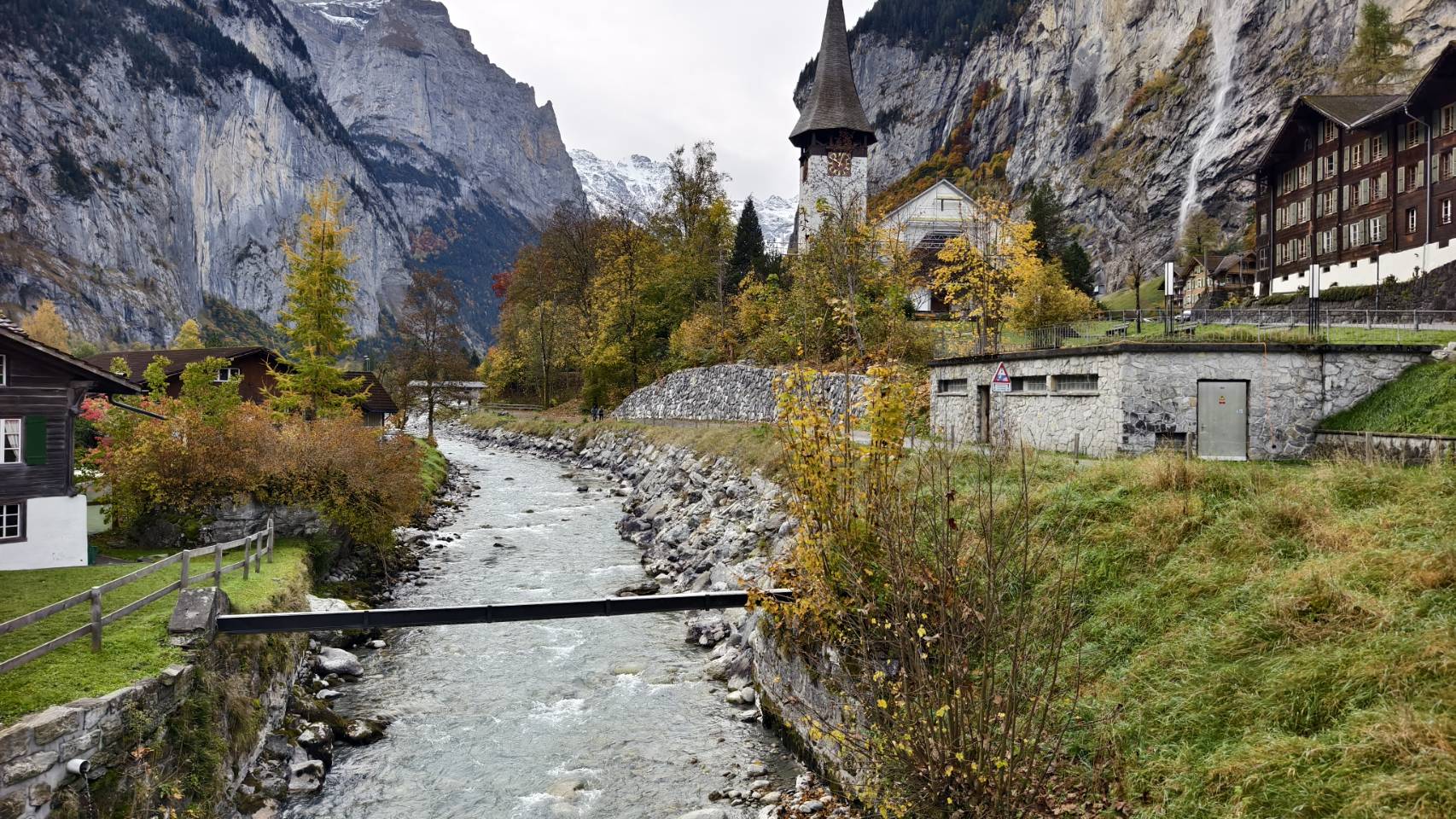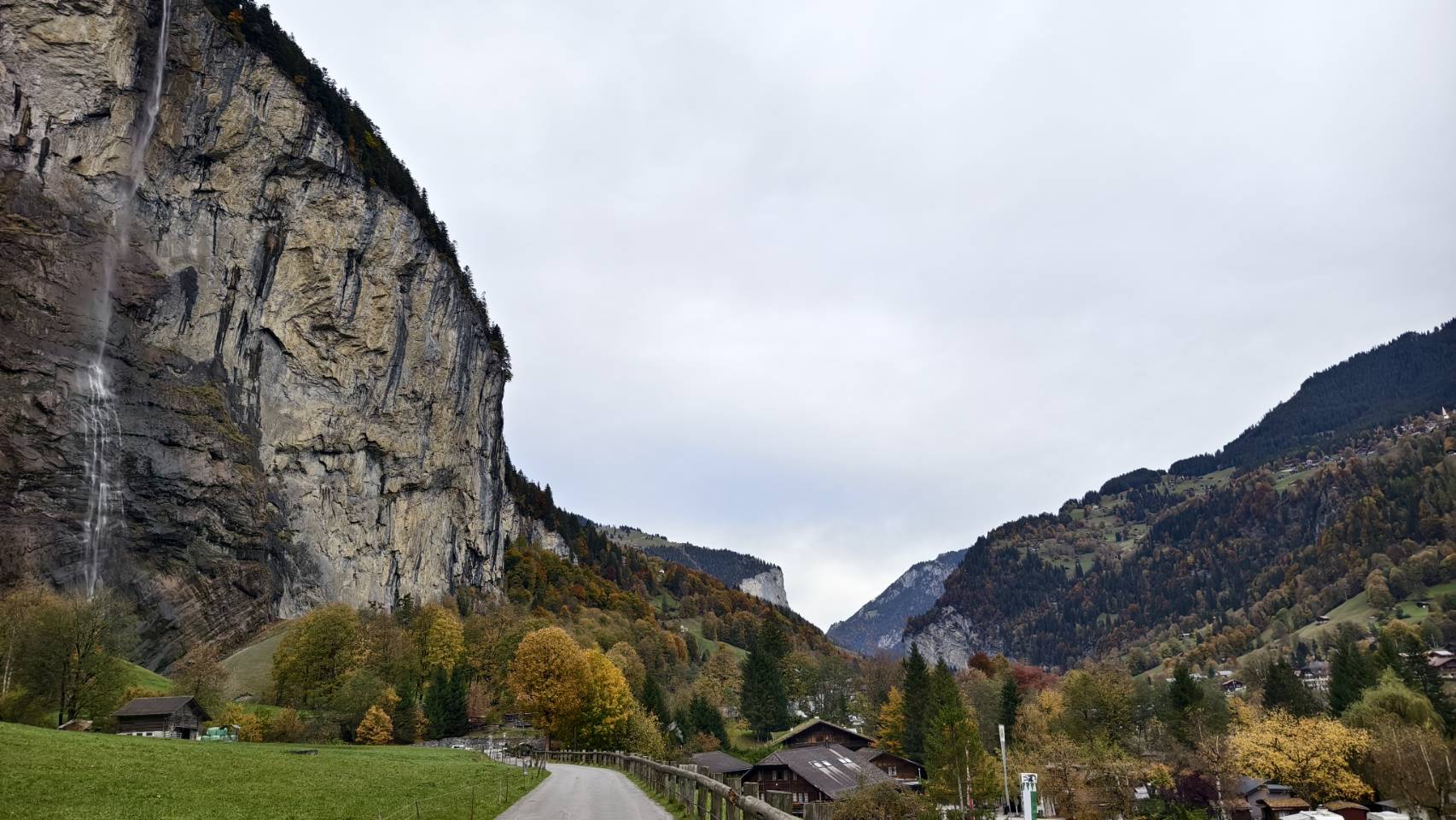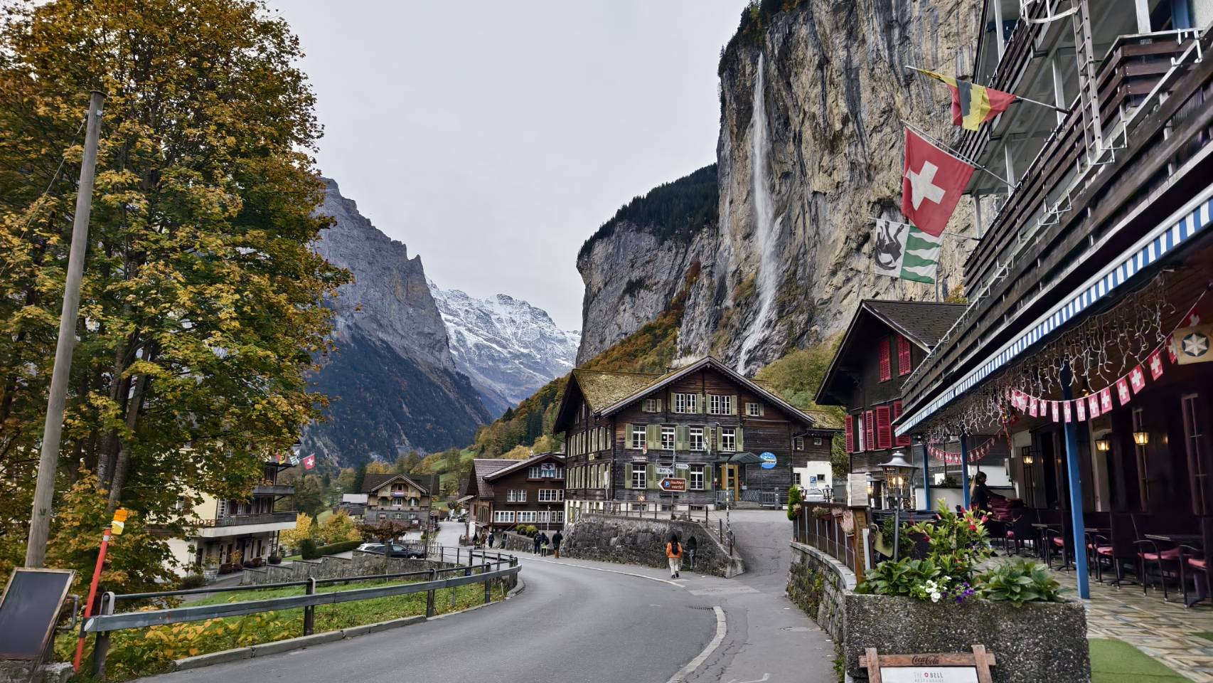 วันนี้ผมเลือกไป Lautenbrunen หมู่บ้านสวยท่ามกลางหุบเขาและหน้าผา ที่โดดเด่นมากๆ ก็คือน้ำตกที่ไหลลงจากยอดเขานั่นเอง สำหรับชื่อของหมู่บ้านเลาเทอร์บรุนเนิน มีความหมายว่า "many fountains" เนื่องจากเป็นหมู่บ้านที่มีน้ำตกน้อยใหญ่ถึง 72 แห่ง โดยเมื่อเดินเข้าไปจะพบน้ำตก Staubbach น้ำตกที่สูงที่ในหมู่บ้านกับความสูง 300 เมตร เมื่อเราเดินเข้าไปยังหมู่บ้านจะได้ยินเสียงน้ำตก รวมถึงมองเห็นสายน้ำได้จากระยะไกลเลยทีเดียว บรรยากาศของใบไม้เปลี่ยนสี ทุ่งหญ้าสีเขียว และเทือกเขาด้านหลังที่ปกคลุมด้วยหิมะก็สวยงามยากที่จะบรรยายแล้วครับ ไม่รวมน้องวัวที่เพิ่มองค์ประกอบให้ภาพที่ตาเห็นมีชีวิตชีวายิ่งนัก โชคดีมากครับที่ภาพส่งกลิ่นไม่ได้เพราะน้องวัวก็นำมาด้วยมูลวัวส่งกลิ่นตลบอบอวลมากมายเวลาเดินผ่าน