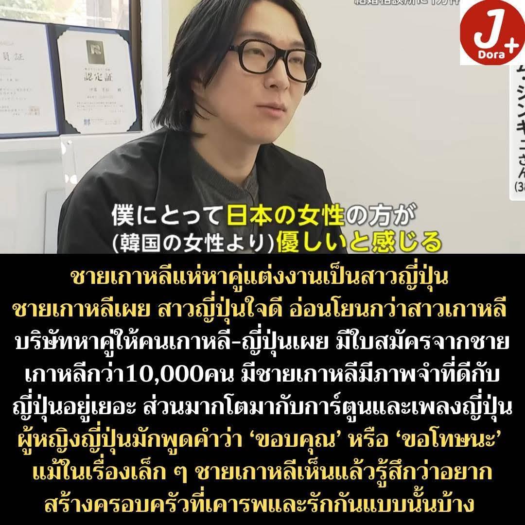 ชายเกาหลีแห่หาคู่แต่งงานเป็นสาวญี่ปุ่น ชายเกาหลีเผย สาวญี่ปุ่นใจดี อ่อนโยนกว่าสาวเกาหลี บริษัทหาคู่ให้คนเกาหลี-ญี่ปุ่นเผย มีใบสมัครจากชายเกาหลีกว่า10,000คน มีชายเกาหลีมีภาพจำที่ดีกับญี่ปุ่นอยู่เยอะ ส่วนมากโตมากับการ์ตูนและเพลงญี่ปุ่น ผู้หญิงญี่ปุ่นมักพูดคำว่า ‘ขอบคุณ’ หรือ ‘ขอโทษนะ’แม้ในเรื่องเล็ก ๆ ชายเกาหลีเห็นแล้วรู้สึกว่าอยากสร้างครอบครัวที่เคารพและรักกันแบบนั้นบ้าง